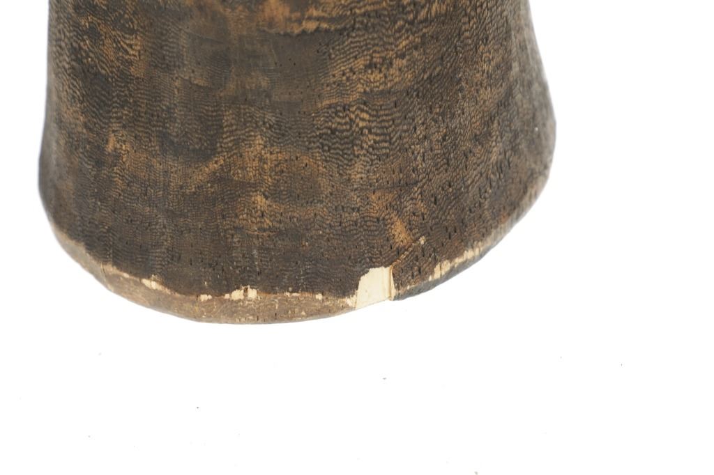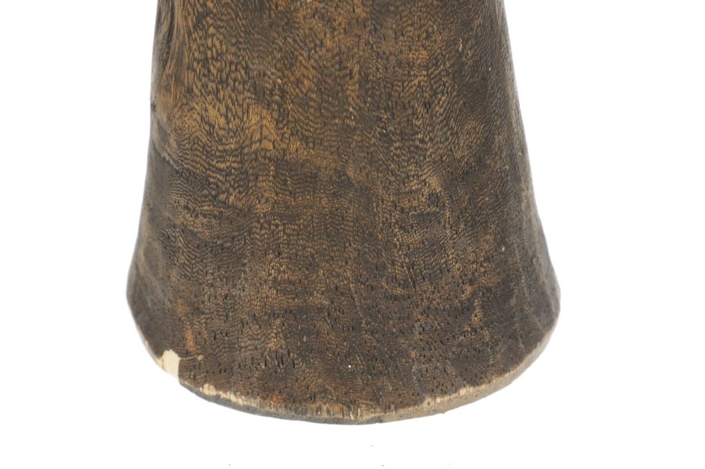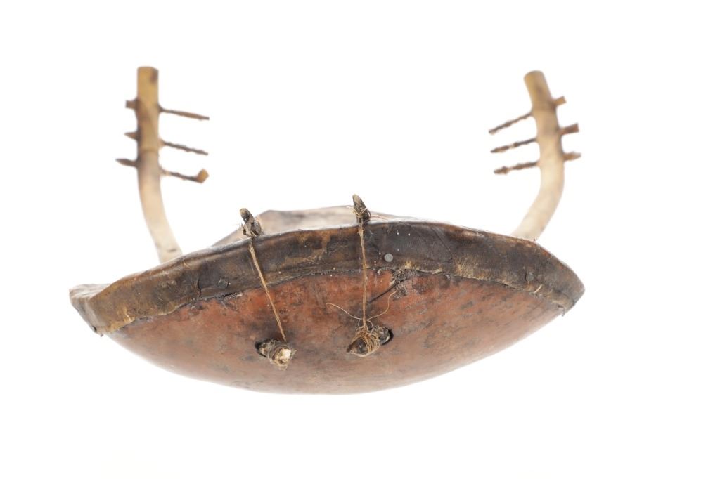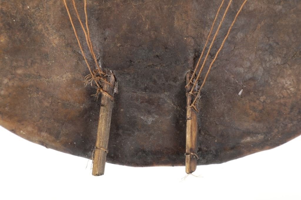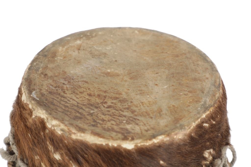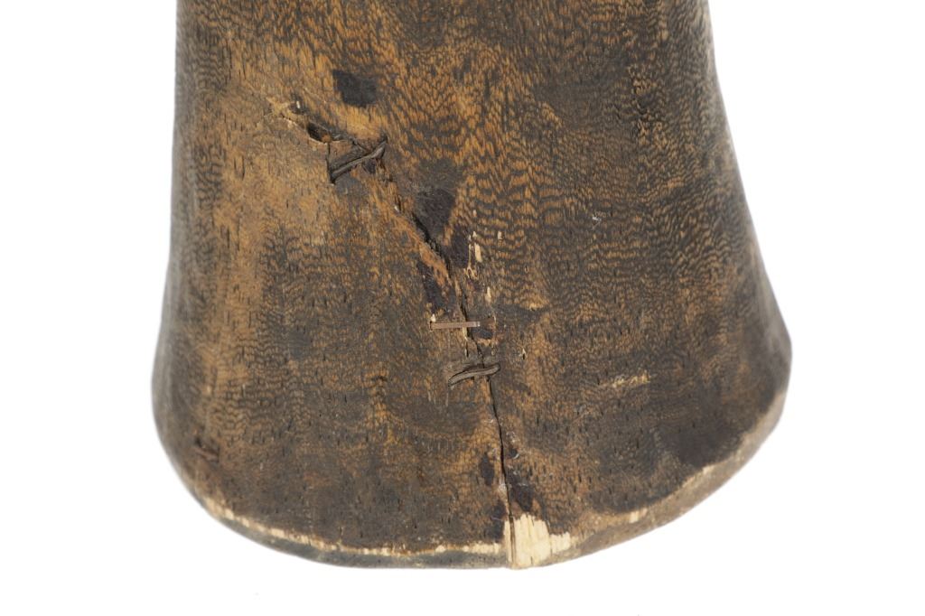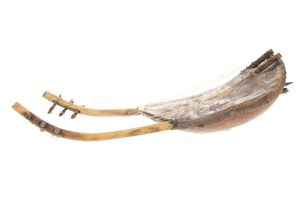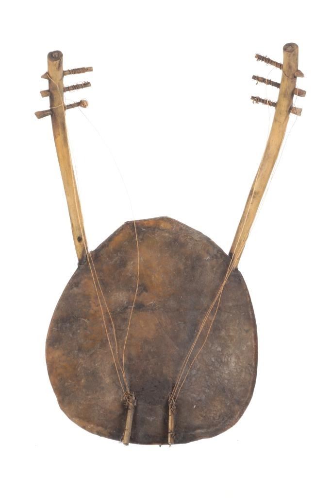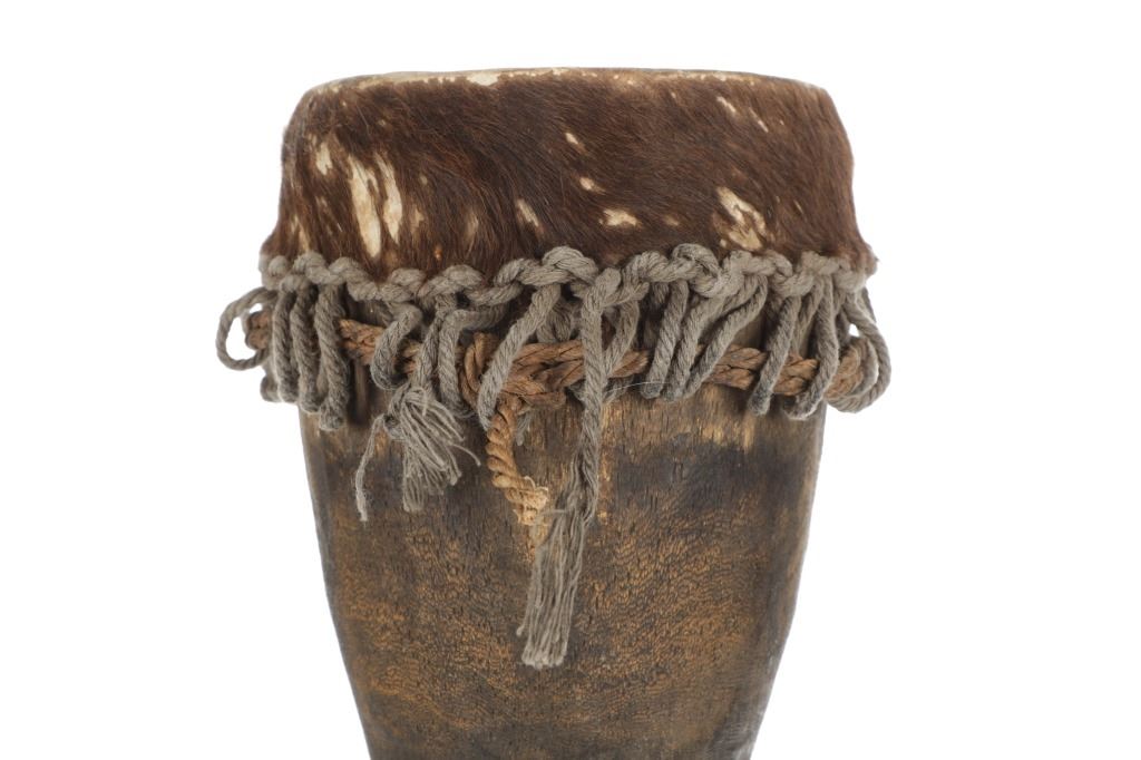 For your bidding pleasure in this lot are two primitive African musical instruments. The first is a Djembe. A Djembe is a goblet-shaped drum, covered with skin and tuned by ropes; the djembe originates from West Africa and has been traced to the Numu. The musical instrument spread across the west coast of Africa with the rise of the Mali Empire (1230 AD). This drum is 22" tall and 6" across the "head". On the bottom of the drum is some damage that was repaired. The next instrument is a Kora. This stringed instrument is made from a calabash gourd and covered in skin. A Kora is usually strummed in accompaniment to storytelling, or singing, and has been in use for over 5000 years. It is extensively used in western and eastern Africa. There are several versions of it across Africa, like the lute, ngoni, gonje, and more. The belly is approximately 10 1/2" x 10 1/2"; the dual necks extend 10 1/2" out from the belly. On the back of the calabash is a patch made of pitch. These instruments are in fair to poor display condition.
