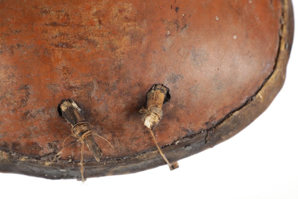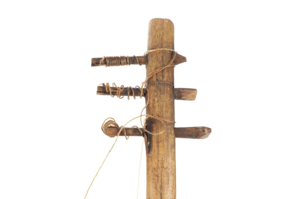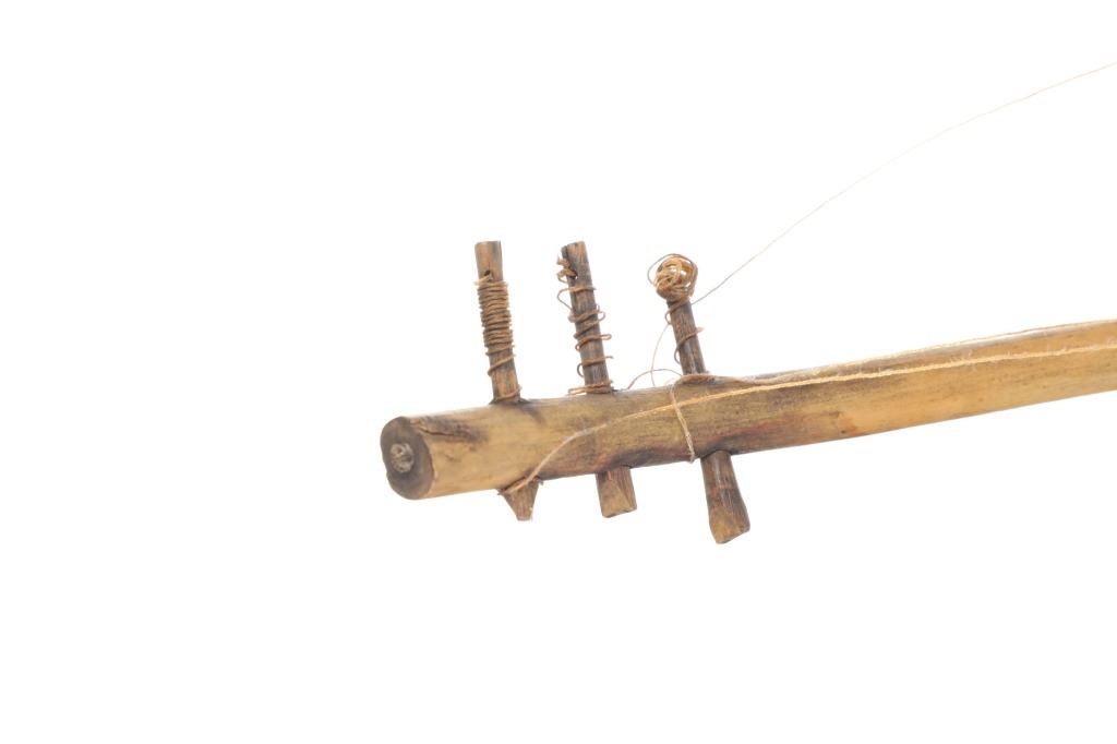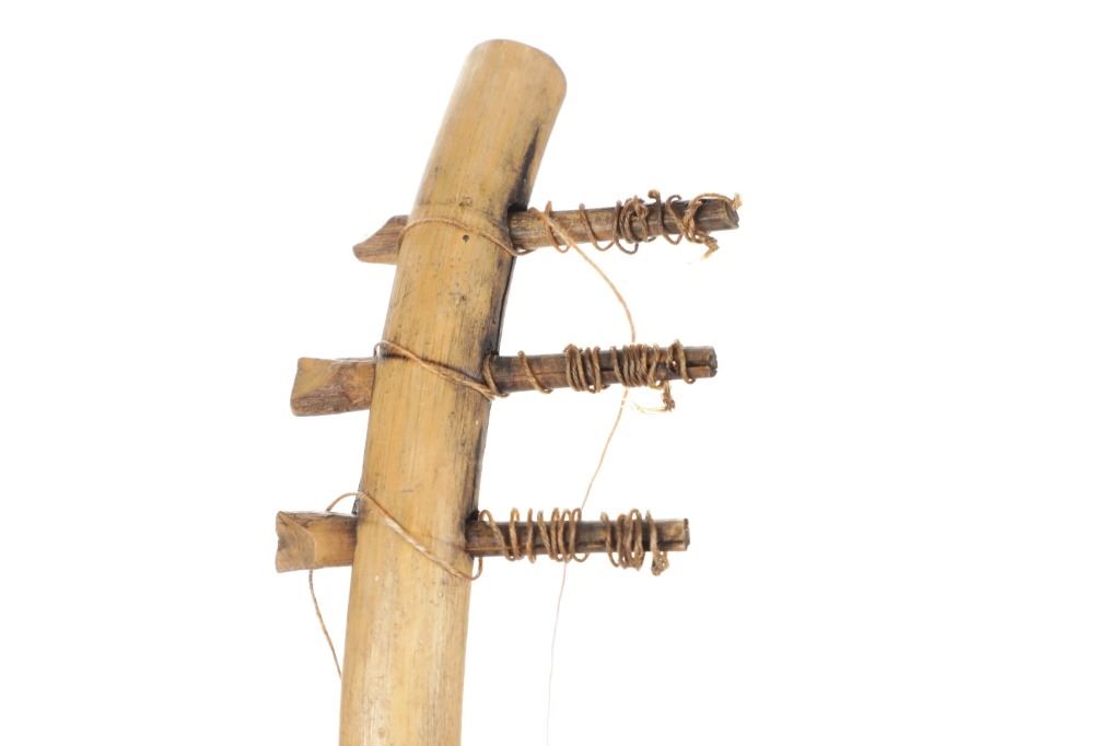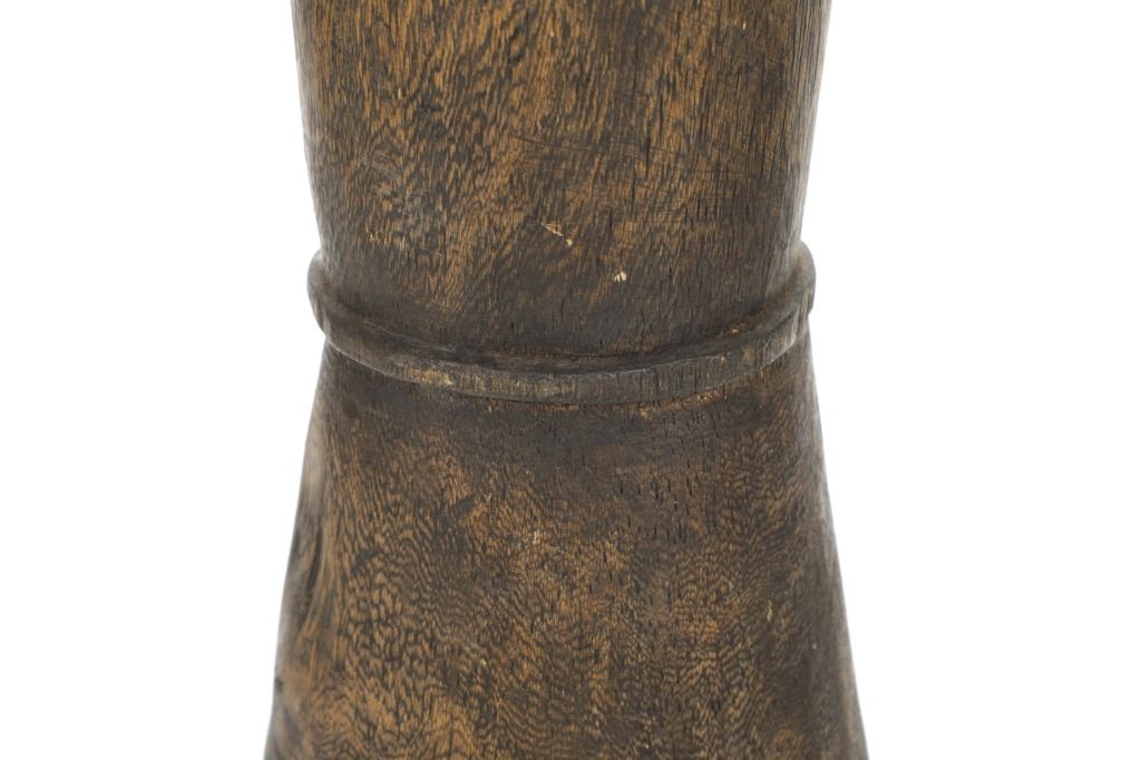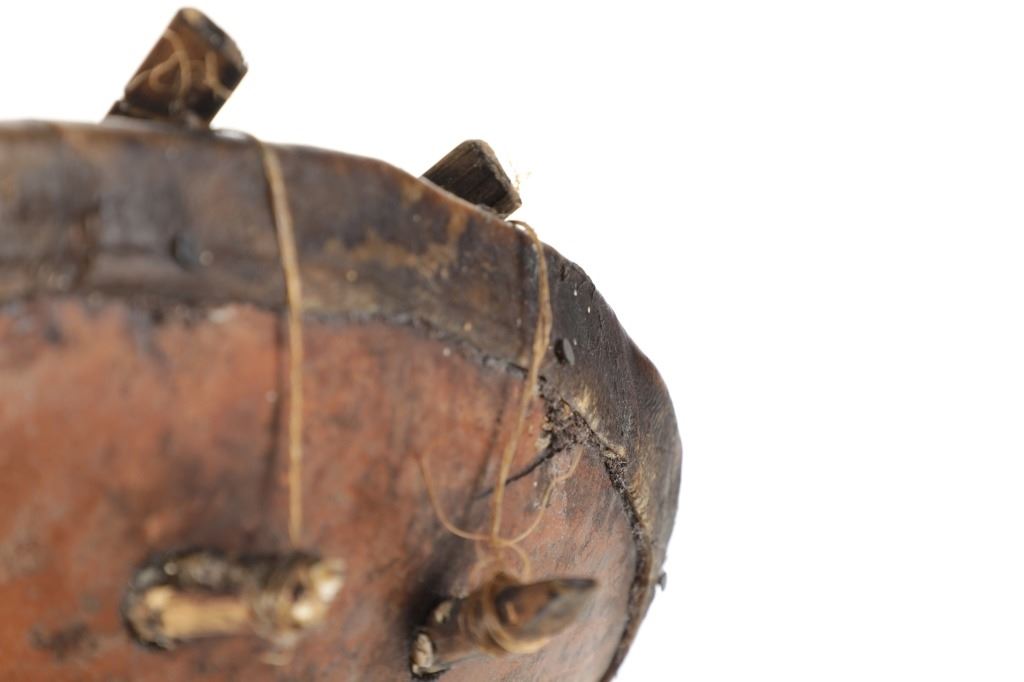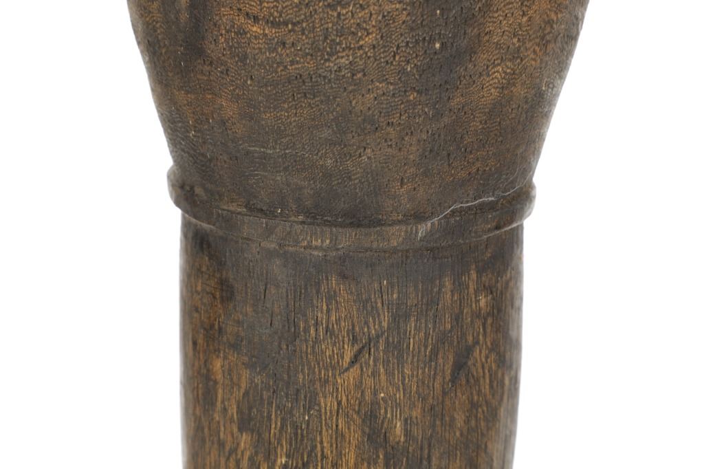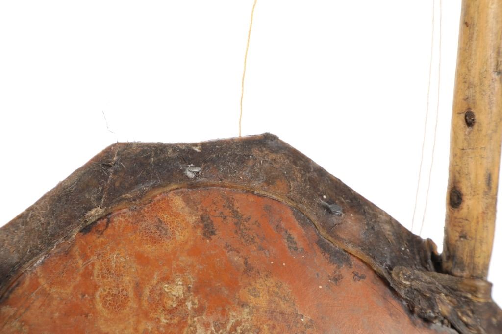 For your bidding pleasure in this lot are two primitive African musical instruments. The first is a Djembe. A Djembe is a goblet-shaped drum, covered with skin and tuned by ropes; the djembe originates from West Africa and has been traced to the Numu. The musical instrument spread across the west coast of Africa with the rise of the Mali Empire (1230 AD). This drum is 22" tall and 6" across the "head". On the bottom of the drum is some damage that was repaired. The next instrument is a Kora. This stringed instrument is made from a calabash gourd and covered in skin. A Kora is usually strummed in accompaniment to storytelling, or singing, and has been in use for over 5000 years. It is extensively used in western and eastern Africa. There are several versions of it across Africa, like the lute, ngoni, gonje, and more. The belly is approximately 10 1/2" x 10 1/2"; the dual necks extend 10 1/2" out from the belly. On the back of the calabash is a patch made of pitch. These instruments are in fair to poor display condition.