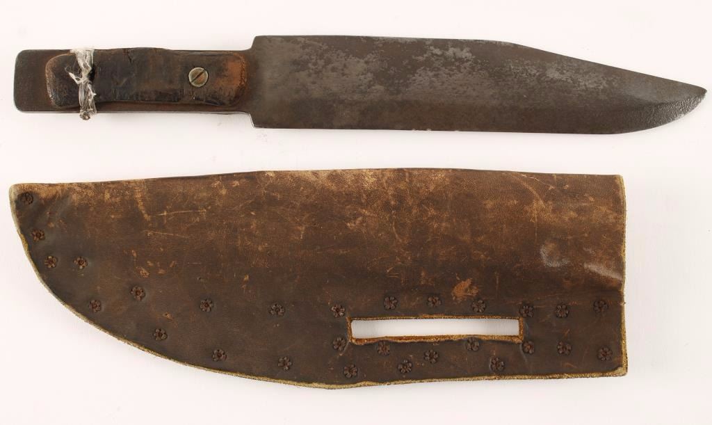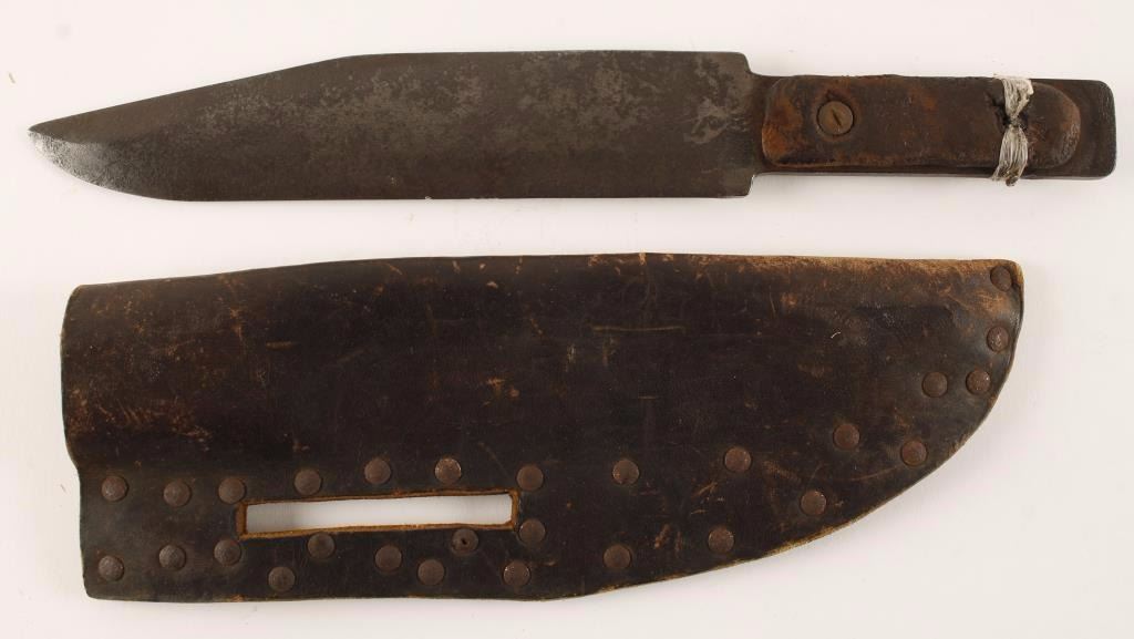 Features a heavy forged steel knife with leather handle affixed by original brass hardware and a string. Knife measures 15" overall with a 9" blade. Includes a dark leather scabbard with grommets. Circa early 19th century, shows age. In overall good condition.