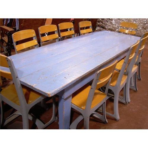 Up for sale is a Old Primitive Sunday School Table, painted in blue and probably from around the 1930s. It has that nice "shabby" look to it, where you can see the age of the piece through its chipping and worn paint. The one corner of the table does have a small chunk out of it (see photo), but it doesn't distract from the piece too much. Ten chairs are included and are all in pretty good shape (but they were used for years by young children, so they are not perfect). All of the chairs were made by The American Seating Co. of Grand Rapids, Michigan. Nine of them measure 25" tall and one is slightly smaller and measures 22" tall. The table measures 19" tall, and is almost 6' long (71.5") and 25" wide. If you have any other questions, please email us. Thanks for looking!!