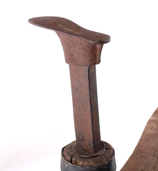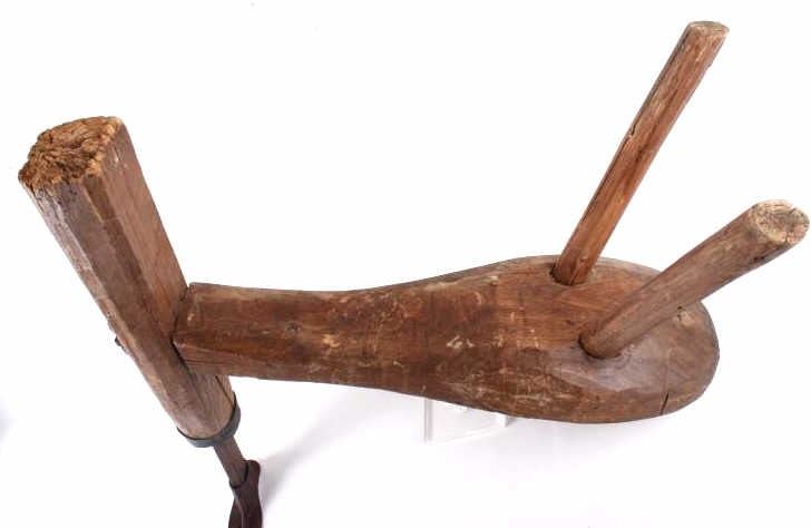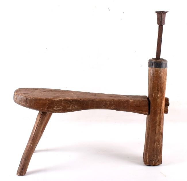 Featured in this lot we have a primitive cobblers bench with a shoe anvil originating for the mid to late 19th century. The bench shows solid construction with a hand carved seat and legs. The shoe anvil is set into the third leg and secured with a metal band. The anvil is marked "DL Hall" on the underside of the piece. The piece is in good condition overall with some wear on the original wood finish and a coating of rust on the anvil. The bench measures 23 1/2" long by 7 1/4" wide and 23 1/2" tall.