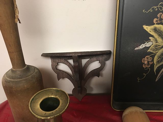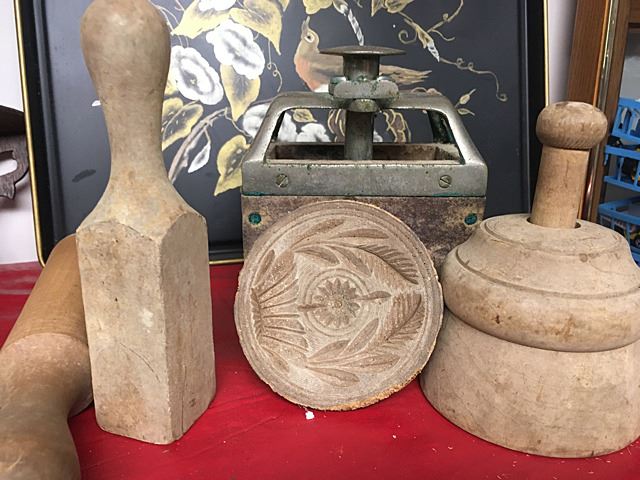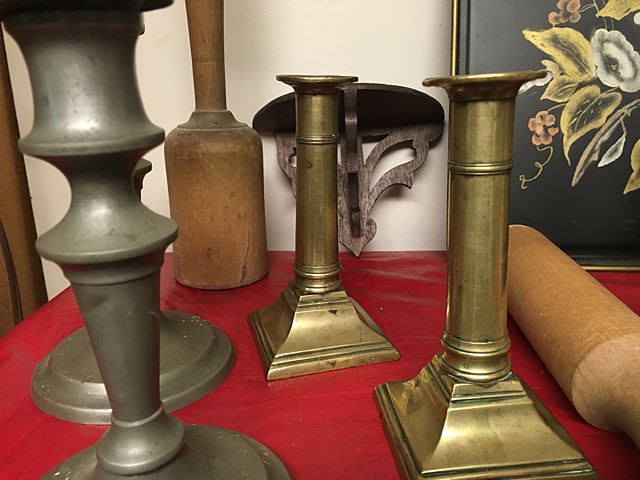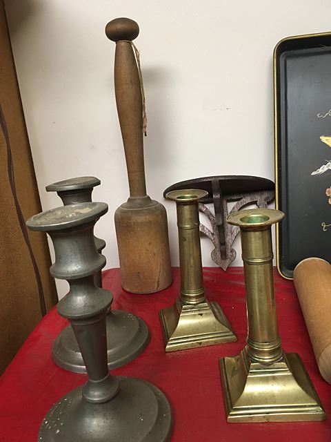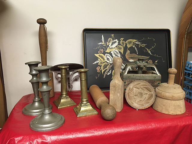 Primitive Collectables Lot includes Queen Anne push up candle sticks, very early (1780-1810), painted toleware tray, pewter candle sticks, butter molds, rolling pins, shelf, etc.