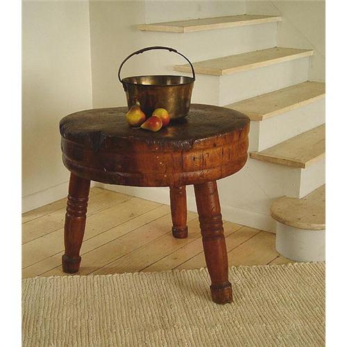 <table width="100%" border="0" cellspacing="0" cellpadding="4"><tr><td><em> STUNNING Round Chopping block Table- VERY DECORATIVE!</em></td></tr><tr> <td width="100%"> This large table measures 30" across. It is a beautiful, antique chopping block table with a marvelous aged surface and a deep mellowed coloration. The top is crafted from a solid block of wood, likely cherry or maple. Handsome details and beautiful proportions make this an ideal piece to serve as a side table. Of course this fine country table is also a perfect piece for the kitchen; the well-worn surface makes an ideal workspace.