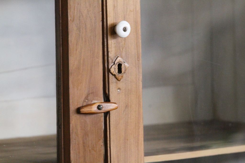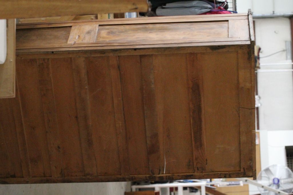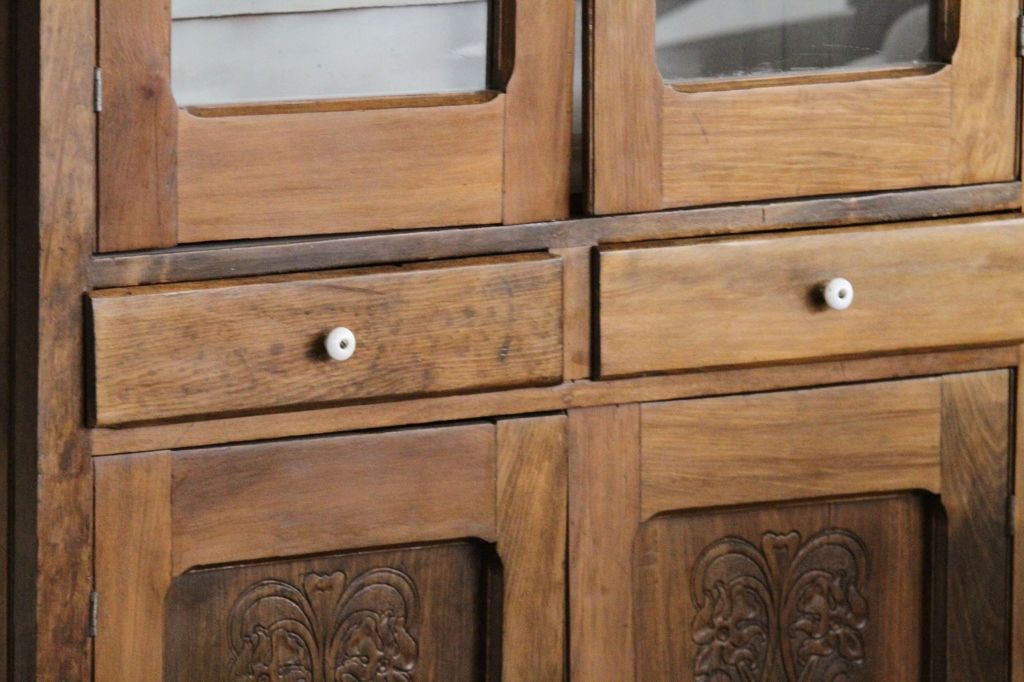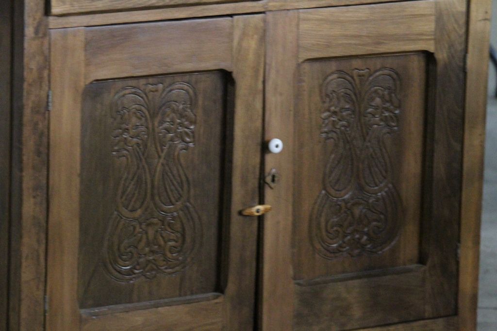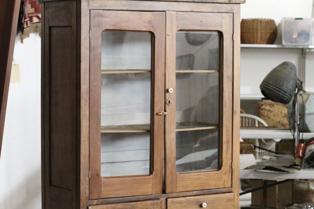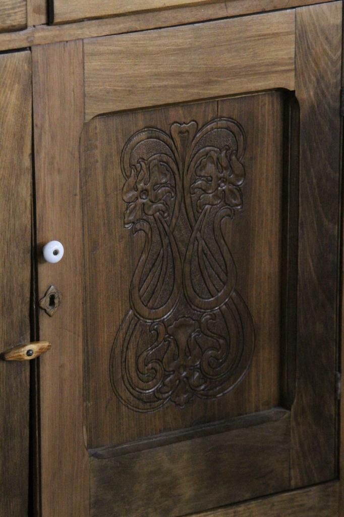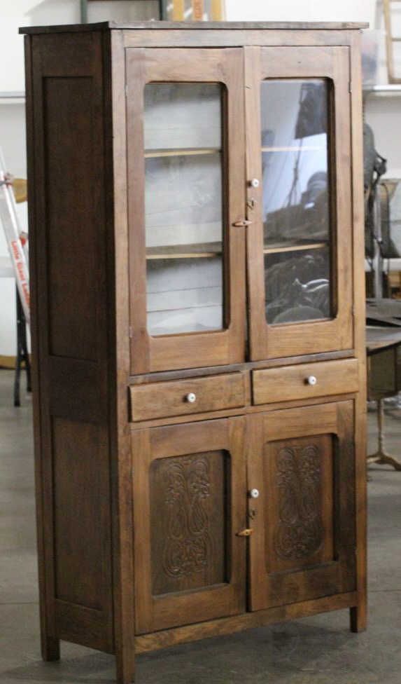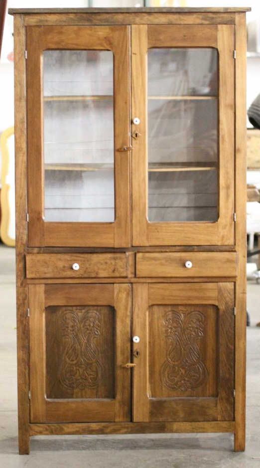 Primitive Country Cabinet Has pressed inlays for doors and all porcelain handles. Measures 17"d x 37"w x 71.5"h.