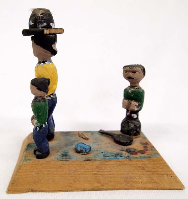 Primitive Early Native American Navajo Folk Art by Delbert Buck, measures 5''H x 6''L x 3''W, signed on bottom in pen, this is a very early Delbert Buck wood carving, man has a chip in his hat, Artist Bio: ''Delbert Buck - Folk Artist: Delbert was born in Shiprock, New Mexico in September of 1976. Like other Navajo folk artists, Delbert is self taught with the unusual distinction of starting at the ripe old age of nine. The idea of carving figures just came to him. When Delbert was eleven years old, his father took some of his pieces to a local trader named Jack Beasley. Jack sponsored Delbert's first gallery show at the age of thirteen.''