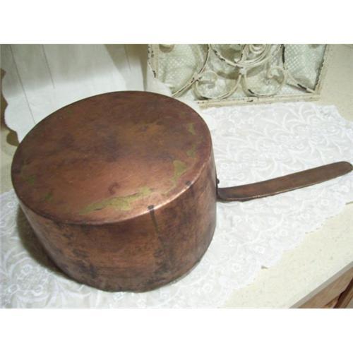Here is an early hand crafted large copper pot. This dates to the late 19th century to early 20th century, and shows alot of age. The pot measures 10" round and 5 1/4" tall. There is an "L" imprinted where the handle meets the pan. (See picture).