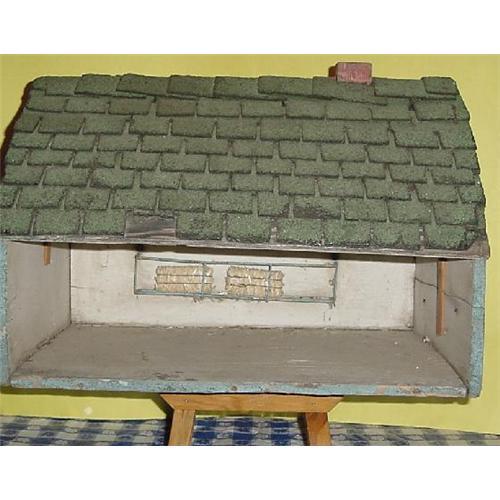 Great Find! Primitive table top Horse Barn w/ Shingled Roof. It even has two hay holders on the inside wall. There are several shingles missing. Please view all four pictures. Dimensions are: 19" long x 12" deep x 12" high (not including short chimney).