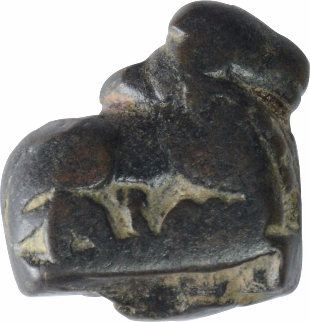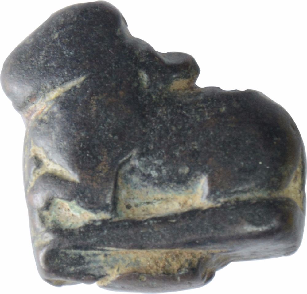 Primitive Money, Bronze Bull, figure of humped bull made of bronze found in a riverbed of Maharashatra, the dating is uncertain but could go back to as early as 1000 BC, 13.35g,17.74 x 18.06mm, about extremely fine, Rare.