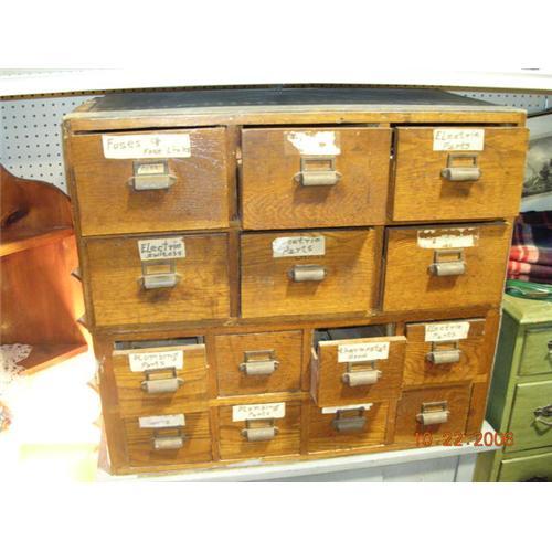 Rough Old 6-Drawer Oak Cabinet. Used to store electrical and plumbing parts. Cabinet measures 15 inches high, 17 inches wide, and 18+ inches deep. The drawers measure about 10 inches wide, 6 1/2 inches high, and 16 inches deep.