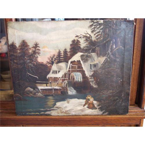 Primitive Oil Painting on canvas.Looks European but I do not know.Bought a number of paintings out of an attic.This is un-framed.Measures approx. 24x30.No signature.Has an old mill,children with sled.There are two repairs(see picture of back) but you don't notice them from the front as the picture is dark in color.