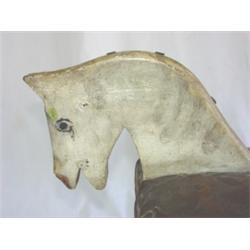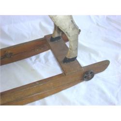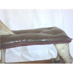 Primitive Painted Rocking Horse with leather seat on yellow painted base. Measures 20" tall by 31" wide. Minor loss to paint.
