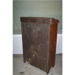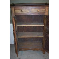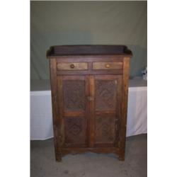 Primitive punched-tin pie safe, 2-door, solid sides, 4-tins in doors, needs some repair on lefthand door hinge, mixed wood - poplar, oak, overall avg/fair condition, 50"h x 30"w x 16"d