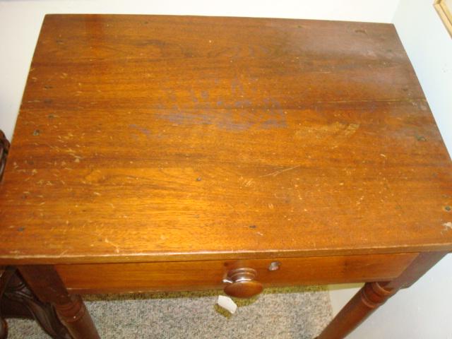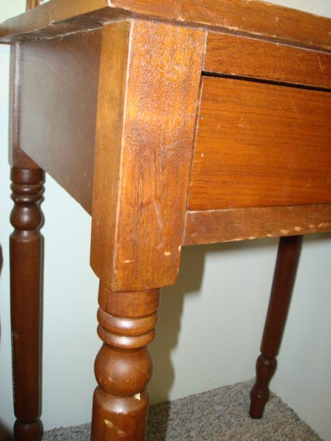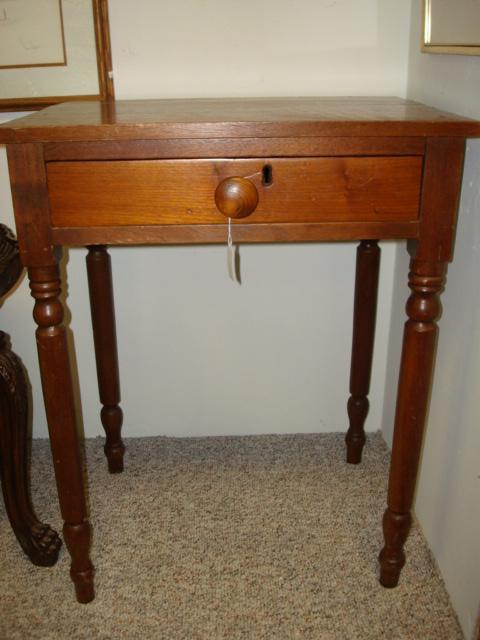 Primitive Single Drawer Pine Side Table:16"W, 23"L, 29"T. Turned Legs, Chamfered Drawer. Ca1890. (100-200)