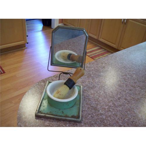 This is an old travel set with afolding mirror, shaving brush and a dish for the shaving soap. It measures 5"x2"x6" when closed. When it is open the mirror is about 8" tall. There is wear to all pieces of this set to a varying degree. I've tried to show it in the pictures so look carefully. In a piece this old you would expect this kind of wear. These are hard to find. They make great accents for bathrooms, especially in a rustic setting.