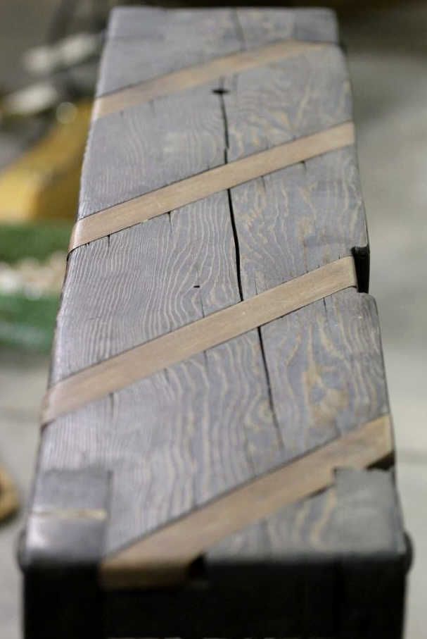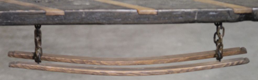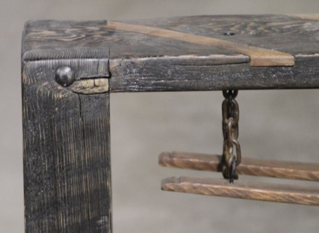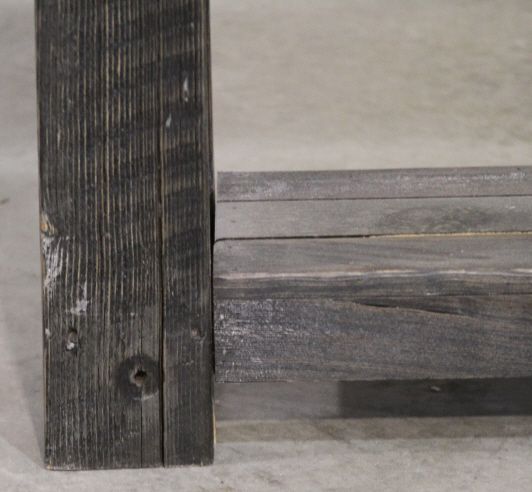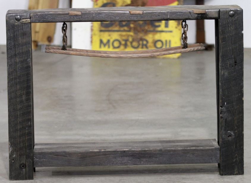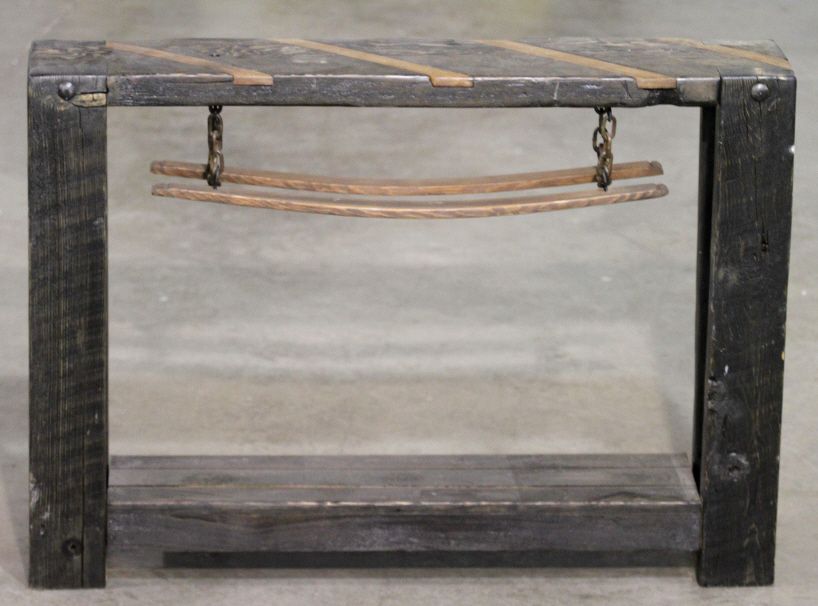 Primitive Wine Rack - This piece is made of primitive wood from a winery and a wine barrel. This Sofa Table is used as a Wine Rack. The pieces of the Wine Barrel hang and hold your wine bottles.