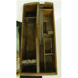 Primitive wood tool caddy. Slots for saw, plane and dividers. Center handle. 19"L x 8.5"W x 8"T. Condition: Good finish and condition.