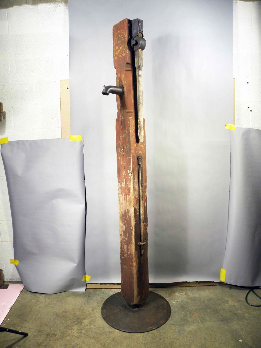 Primitive Wood Water Pump. Sold by Manchester Water Wear Co., Manchester, NH. Original stenciling, fair original condition. 82 inches tall.