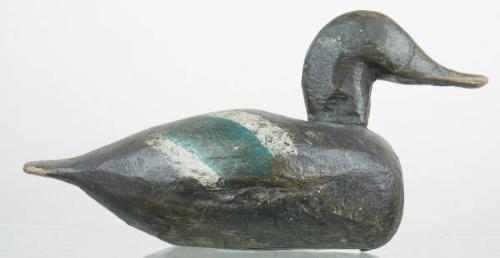 Primitive little bluebill hen decoy by Oliver Ainget, Lake Geneva, WI ca 1925-1930. Working paint, narrow check on the back. (decoy)