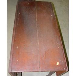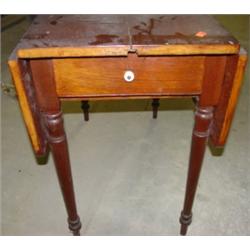 Primitive one drawer table with drop leaves. Measures 30" tall and 36" x 17" with each leaf measuring 10 3/4". Top is split from one end to the other.