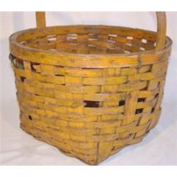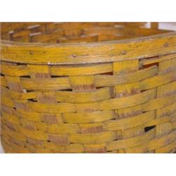 Primitive orange painted basket. Measures 14" tall and 14" in dia. Some breaks and losses are visible.