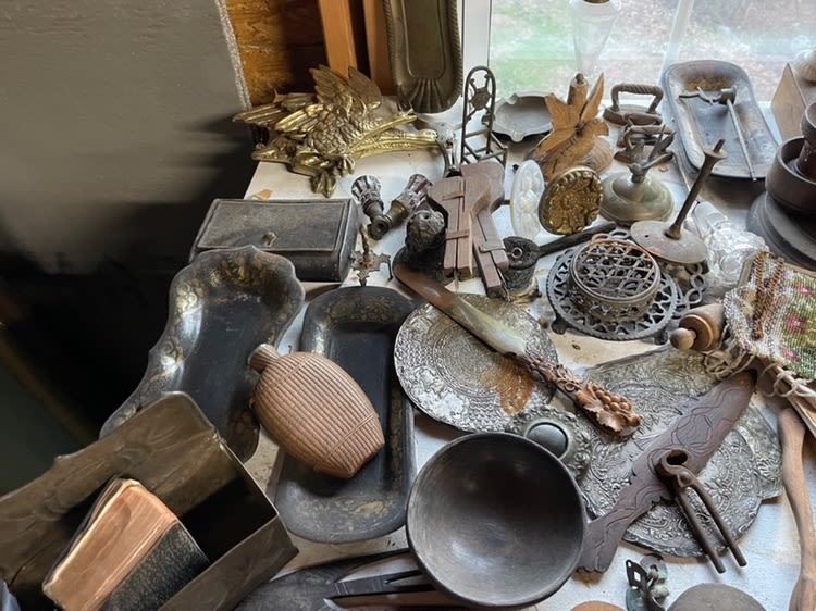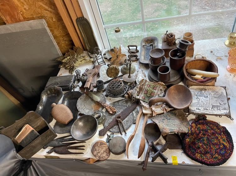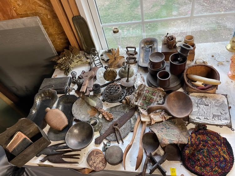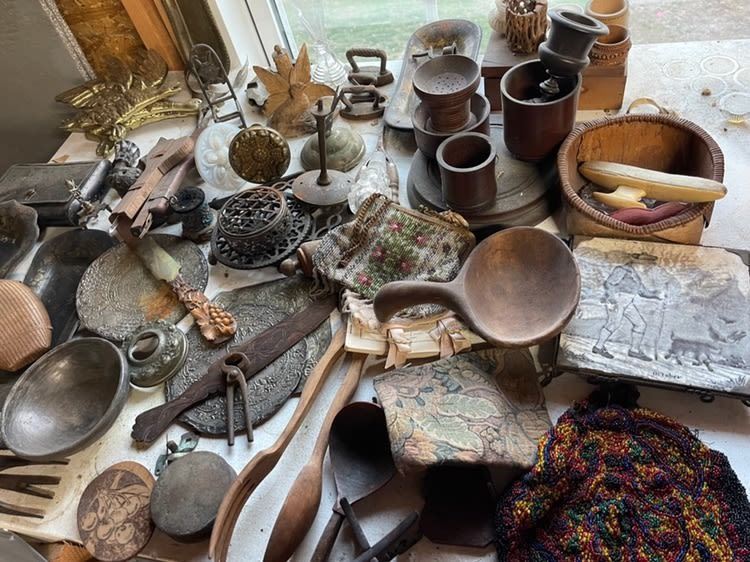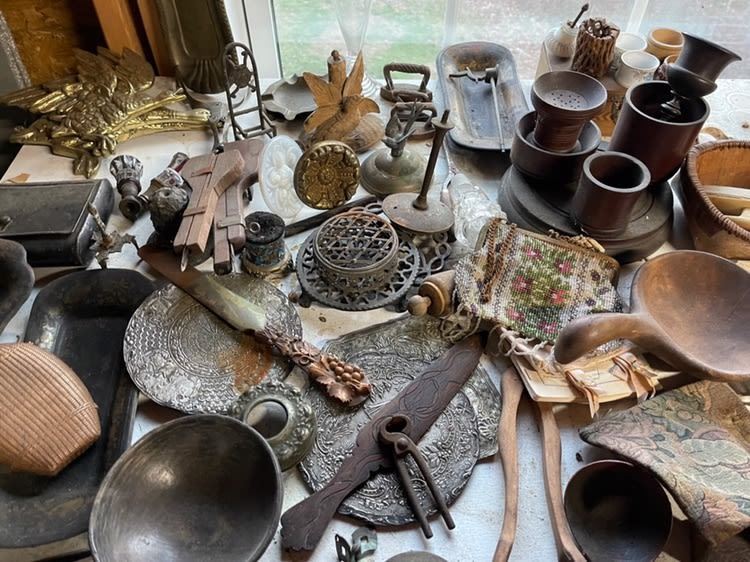 Primitive collection including toleware, woodenware, purses, etc., all from the attic!