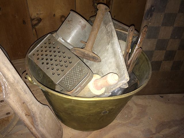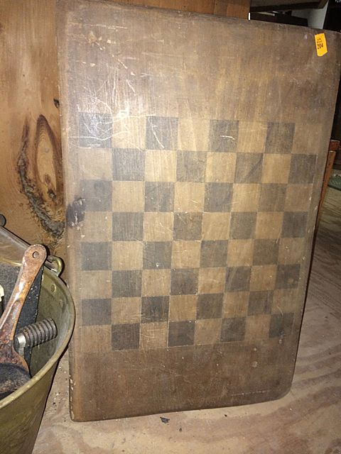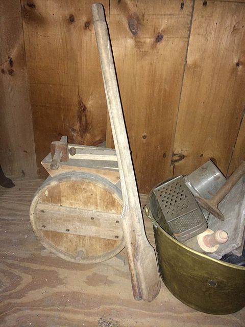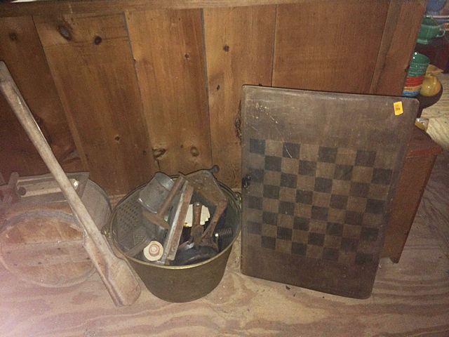 Primitives Lot includes vintage wooden checker board, brass pot full of vintage kitchen items, paddles, butter churn.