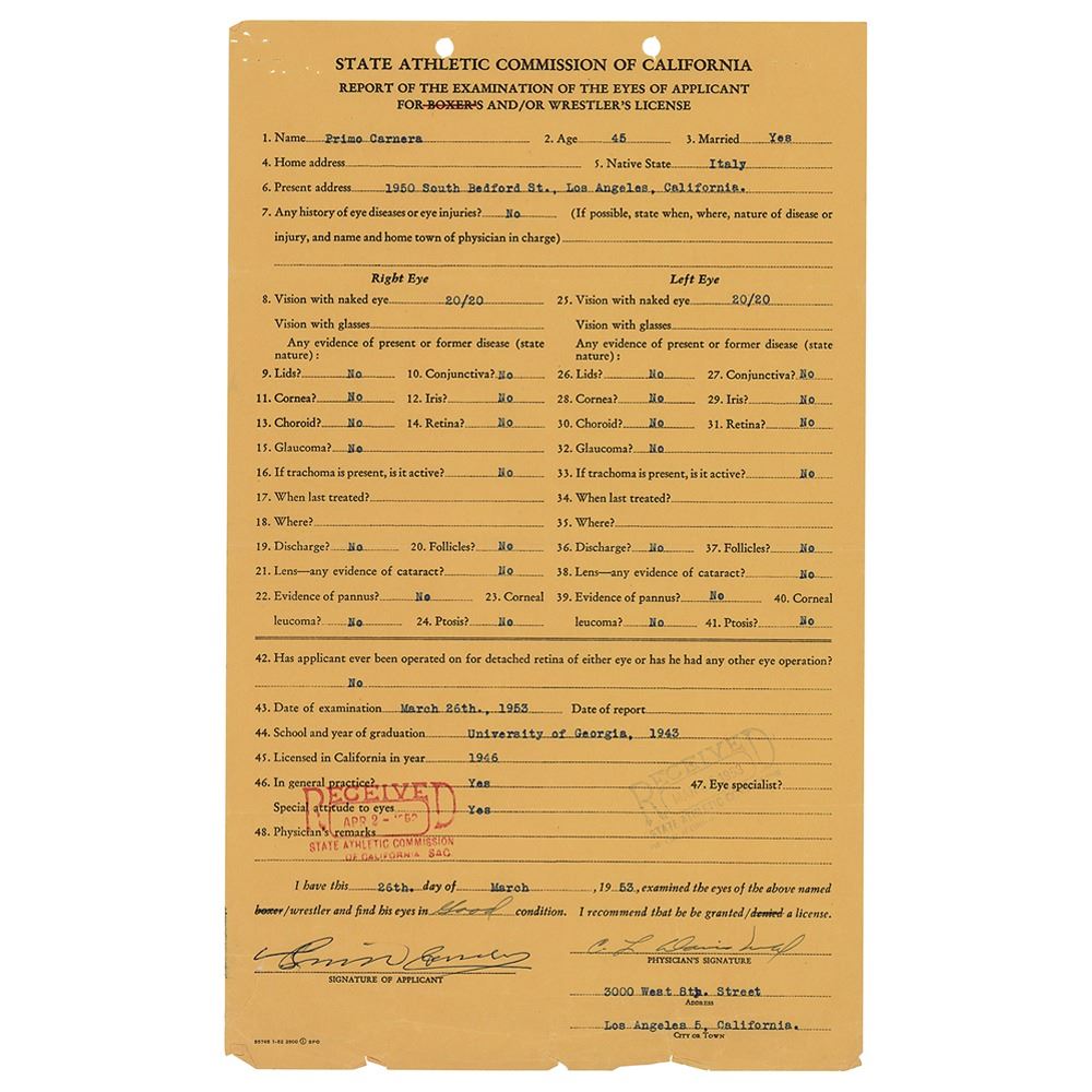 DS, one page, 8.5 x 14, March 26, 1953. A State Athletic Commission of California eye examination report for a boxing and/or wrestling license, which is filled out in type and lists the results of an exam held for Primo Carnera. The exam notes his age (“45”), his marital status, address, native state (“Italy”), his school and year of graduation (“University of Georgia, 1943”), and lists both right and left eyes as being “20/20,” with the physician deeming them to be in “Good” condition. Signed at the conclusion in ink by Carnera. The word "Boxer's" in the header has been struck through in red ink. In fine condition, with edge wear and short tears, mainly to bottom edge.