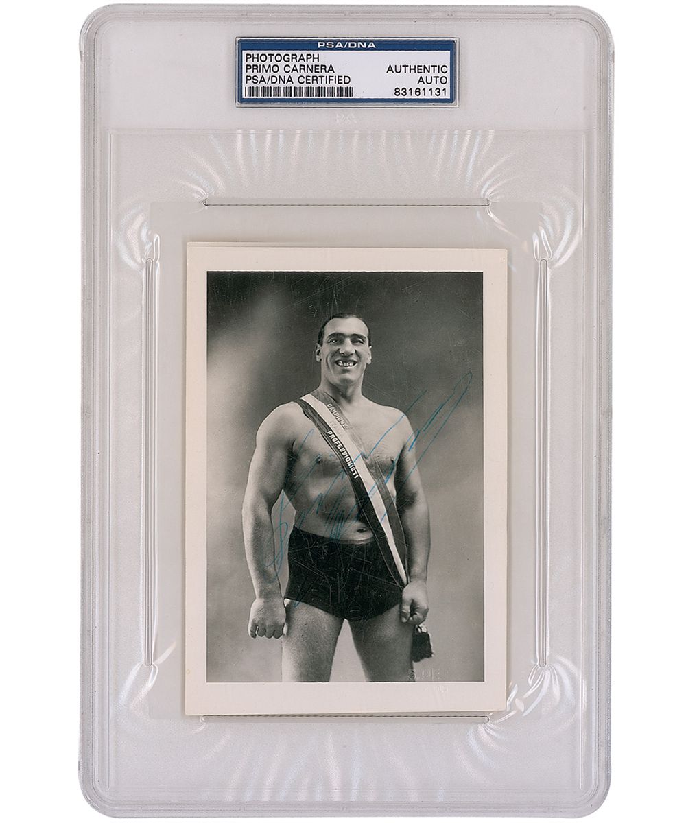 Vintage glossy 4 x 5.75 photo of Carnera proudly posing in a championship sash, signed in blue ballpoint. Encapsulated in a plastic PSA/DNA authentication holder. Mild contrast to the signature, which is light, but mostly legible, and photographer’s stamp to bottom edge, otherwise fine condition.