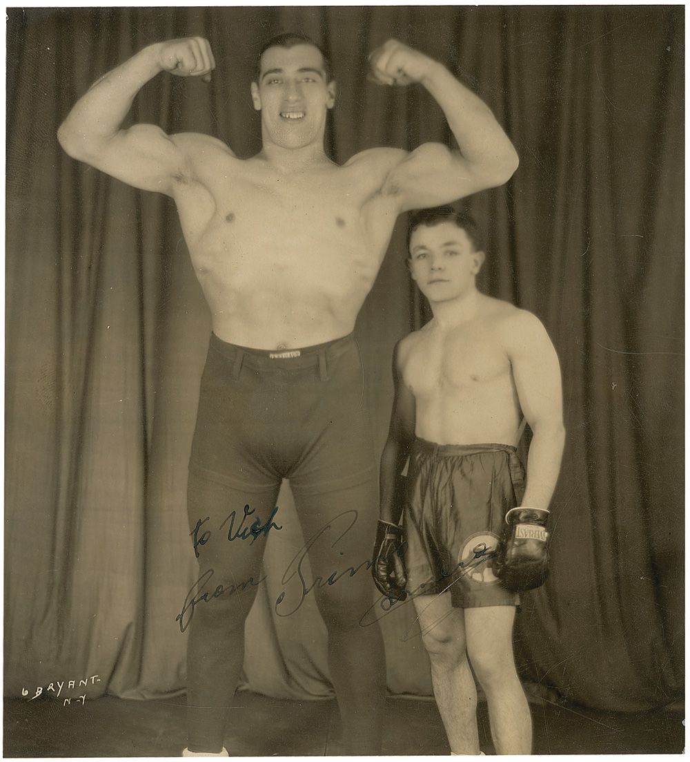 Vintage glossy 7 x 7.5 double weight photo of the ‘Ambling Alp,’ towering over another boxer, signed and inscribed in fountain pen “To Nick from Primo Carnera.” In very good condition, with moderate contrast to last name of signature, trimmed edges, scattered light surface marks and impressions, and light rubbing to finish.