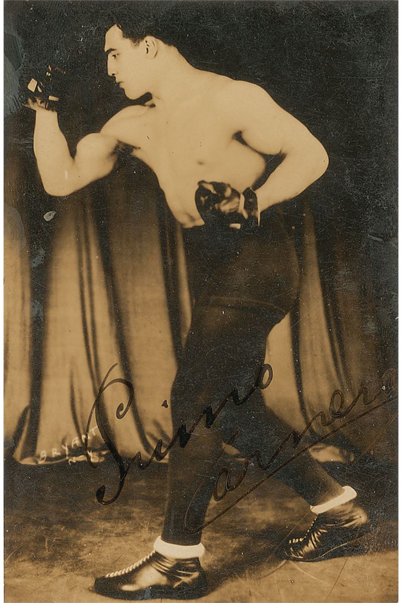 Uncommon vintage sepia glossy 3 x 4.75 real photo postcard of the musclebound fighter taking some swings, signed in fountain pen. In fine condition, with overall silvering to dark areas of the image and slightly trimmed edges.