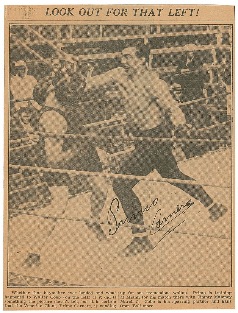 Vintage 6 x 8 newspaper photo of Carnera during training, signed in fountain pen. Affixed to a slightly larger sheet. In fine condition, with a very subtle central horizontal fold.