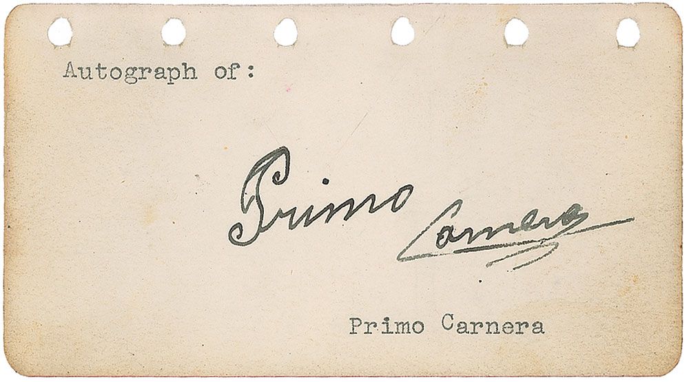 Vintage fountain pen signature, “Primo Carnera,” on an off-white 4.5 x 2.5 page. In fine condition, with a bit of toning and soiling to lower corners.