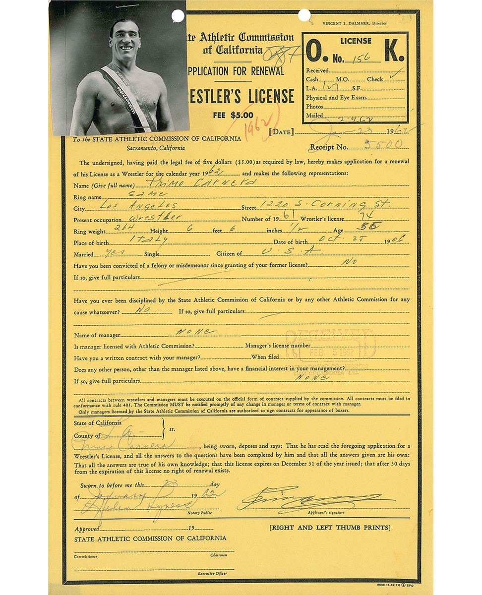 Partly-printed DS, one page, 8.5 x 13, January 23, 1962. State Athletic Commission of California application for renewal of his wrestler’s license, filled out in another hand with Carnera’s information, including “Present occupation: Wrestler” and “Ring weight: 264,” and signed at the conclusion in ballpoint by Carnera. A vintage glossy photo of the shirtless Carnera wearing a victory sash is stapled to the upper left corner. In fine condition, with expected document wear. Accompanied by a full letter of authenticity from PSA/DNA. This was the last application Carnera filed with the state.