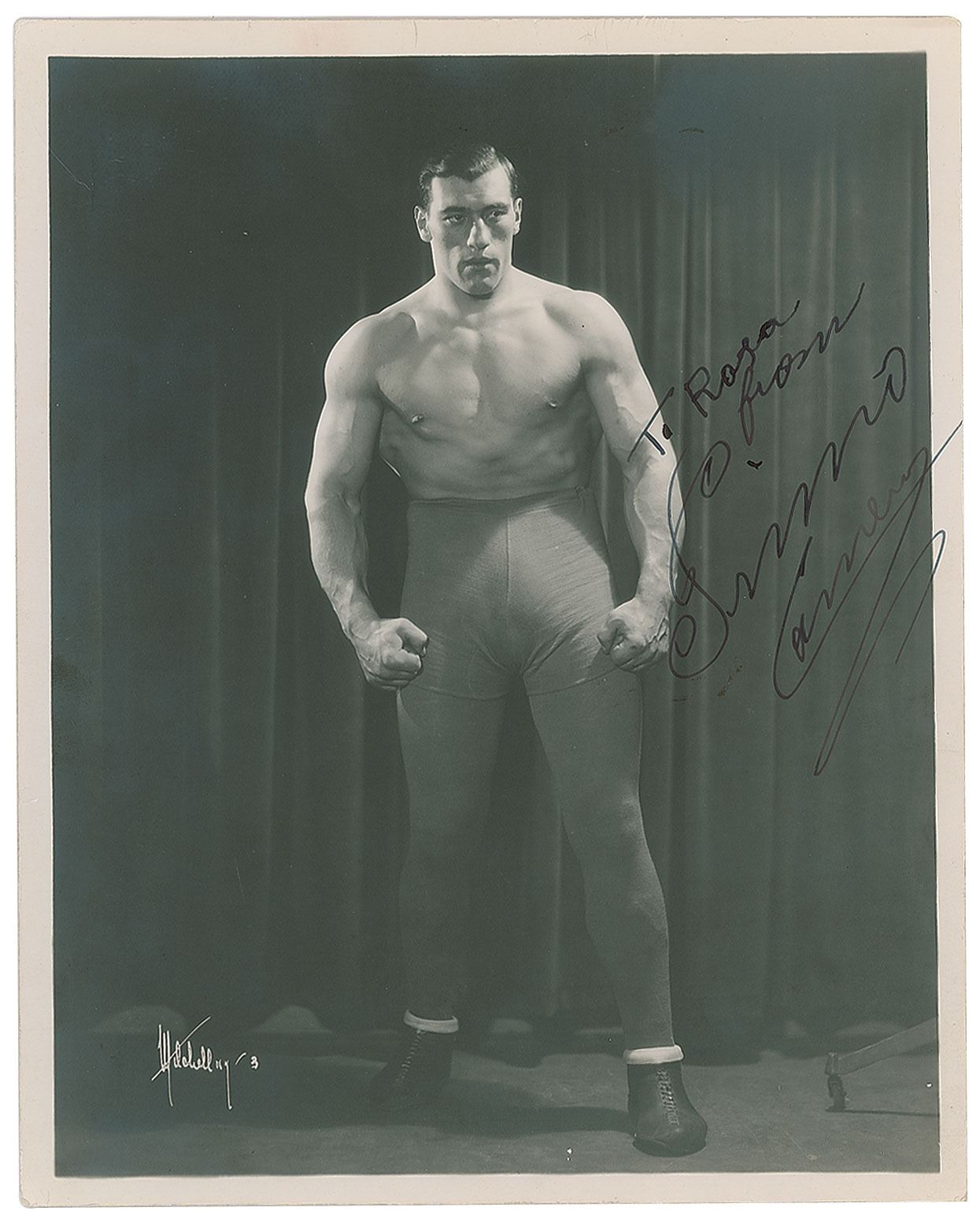 Magnificent vintage matte-finish 8 x 10 full-length photo of the hulking Italian boxing champ by the Mitchell Studio of New York, signed and inscribed in fountain pen, "To Rosa, from, Primo Carnera.” In fine condition, with light silvering to the background. Accompanied by a full letter of authenticity from JSA.