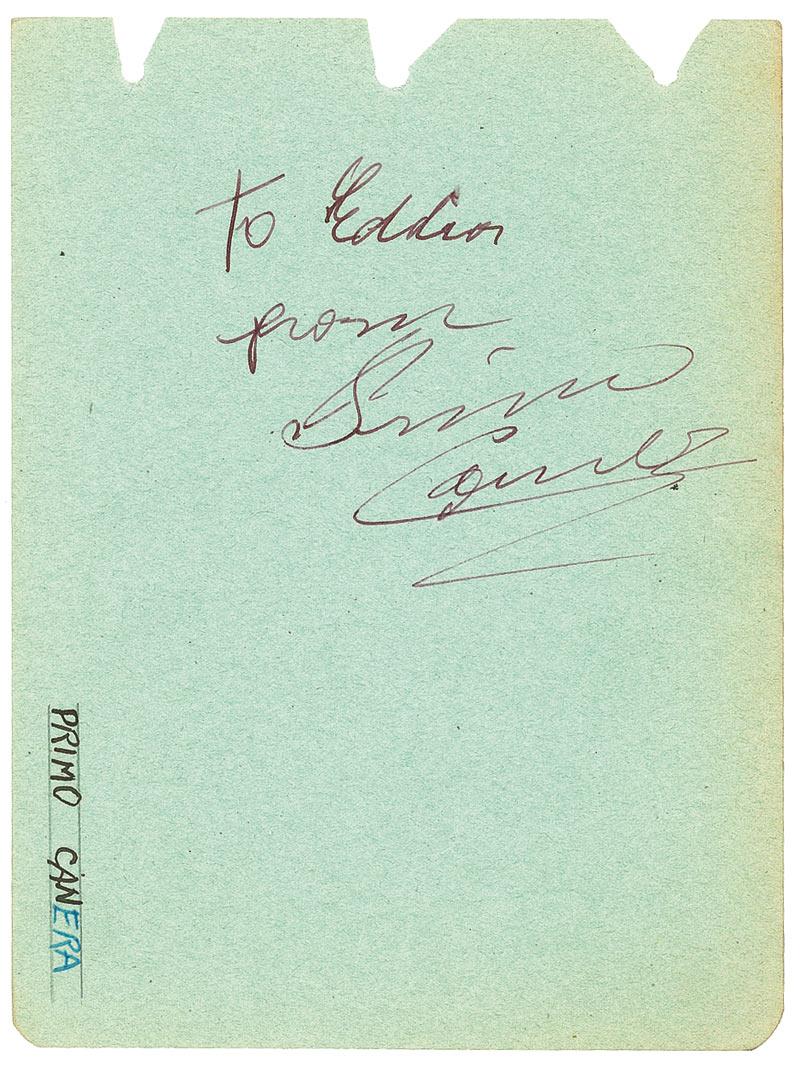 Fountain pen signature and inscription, “To Eddie from Primo Carnera,” on a green 4.5 x 6 album page. In fine condition, with mild edge toning touching the edges of his name and three torn punch holes (easily matted out).
