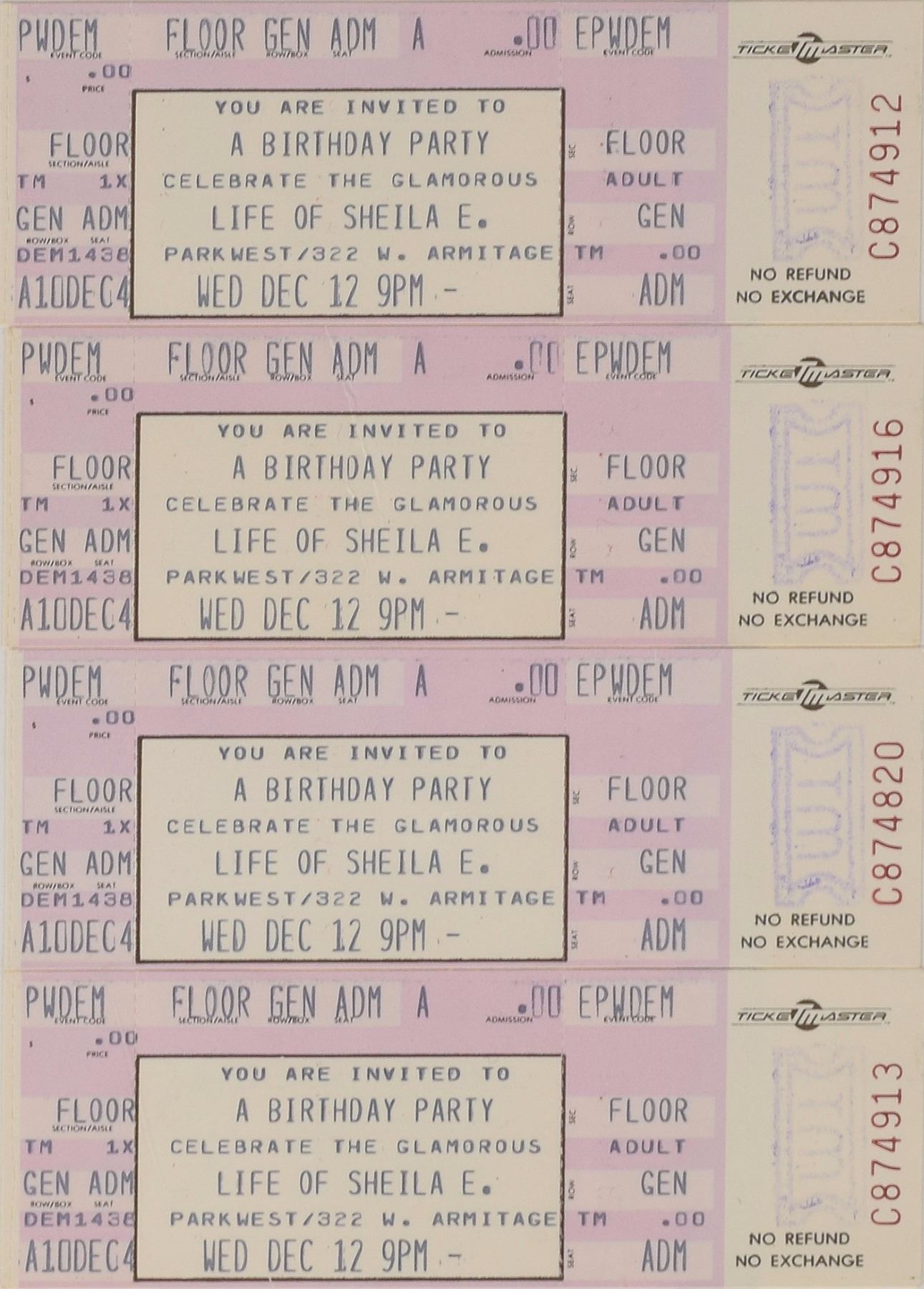 Uncommon set of four 5.5 x 2 general admission tickets for Sheila E.'s private 'birthday party' concert at Chicago's Park West on December 12, 1984. In overall fine condition. From the collection of Prince’s former assistant.
