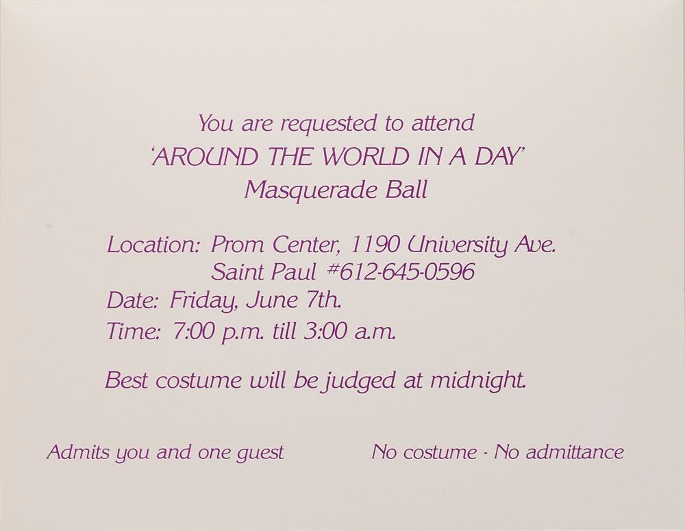 Sought-after invitation card to Prince’s 27th birthday party at Prom Center in St. Paul, Minnesota, on June 7, 1985. The stylized invitation, measuring 5.5 x 4.25, admits the recipient and one guest for an ‘Around the World in a Day’ masquerade ball and costume contest, clearly stating along the bottom, “No costume—No Admittance.” In fine condition. The consignor organized the extravagant event for Prince within three weeks notice. From the collection of Prince’s former assistant.