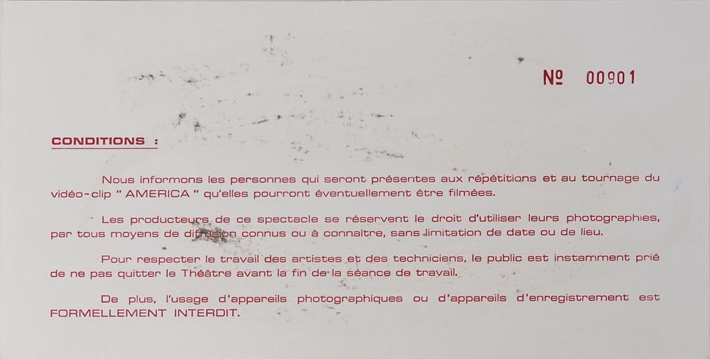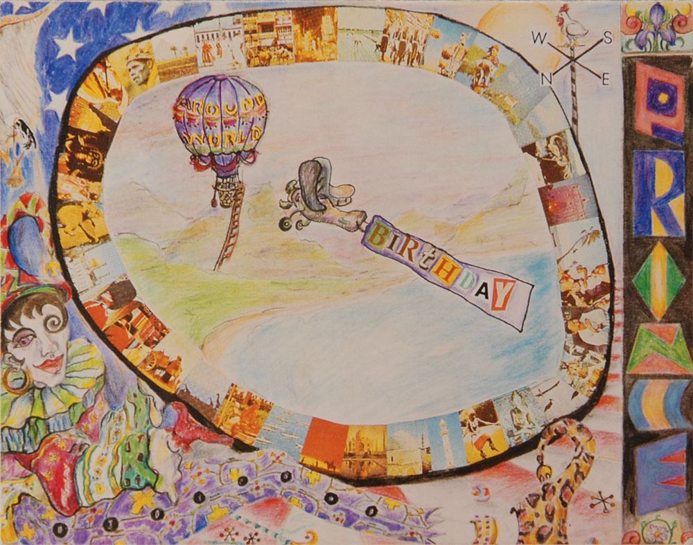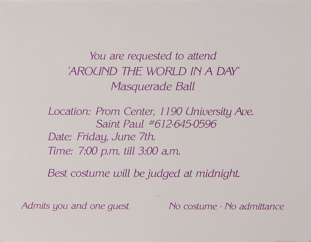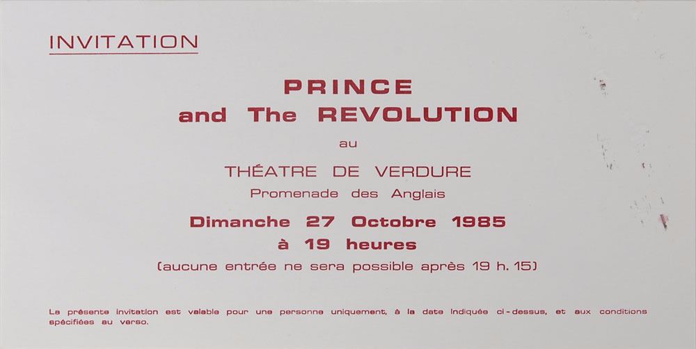 Two invitations for private parties: one sought-after stylized 5.5 x 4.25 invitation card to Prince's 27th birthday party at Prom Center in St. Paul, Minnesota, on June 7, 1985, admitting the recipient and one guest for an 'Around the World in a Day' masquerade ball and costume contest, clearly stating along the bottom, "No costume-No admittance"; and an invitation to a private Prince and the Revolution show at the Theatre de Verdure on October 27, 1985, during the shooting of Under the Cherry Moon. In overall fine condition, with mounting remnants to reverse of each and small bits of surface loss to front right of concert invitation. From the collection of Prince's assistant tour manager Gwen Leeds.