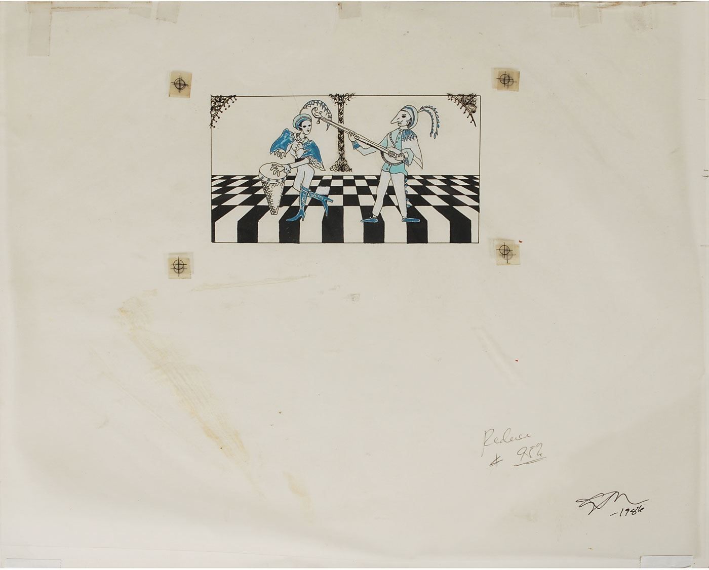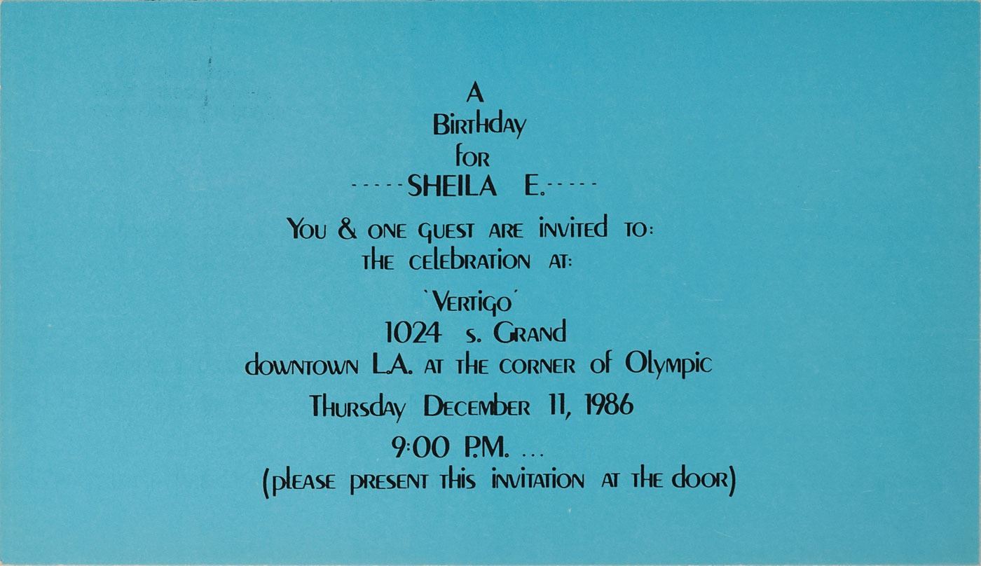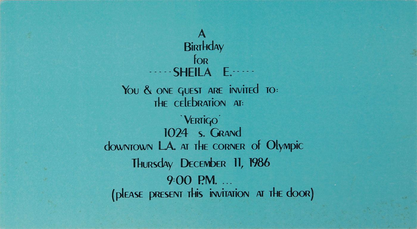 Original artwork drawn by Elizabeth Moore for Sheila E.'s 29th birthday party, with the image measuring 6.5 x 3.5 on a 16 x 13 sheet, portraying two medieval musicians on a checkerboard floor; the embellishments in the corners and center are on a celluloid overlay. Signed and dated in the lower right by the artist. Matted to an overall size of 21 x 18. In fine condition, with some portions of staining to lower blank portion and a fold to lower right corner of celluloid. Accompanied by two copies of the corresponding invitation that used this artwork, which has details for the party on the reverse: "A Birthday for Sheila E., You & one guest are invited to the celebration at: 'Vertigo,' 1924 S. Grand, downtown L.A. at the corner of Olympic, Thursday December 11, 1986, 9:00 P.M., (please present this invitation at the door)." From the collection of Elizabeth Moore and accompanied by a letter of provenance. Moore worked for Prince on the Purple Rain Tour as his personal wardrobe assistant, as well as event designer and decorator; she also worked intimately with Prince designing and creating original artwork for his party invitations and personal holiday cards.