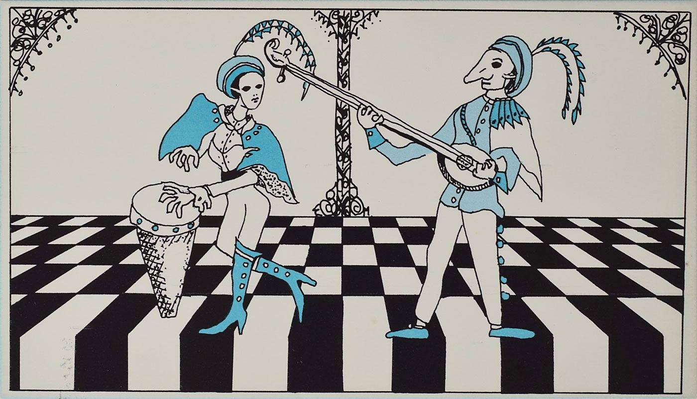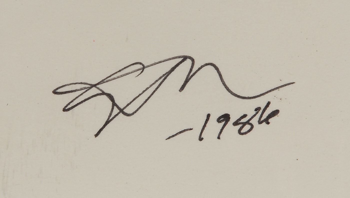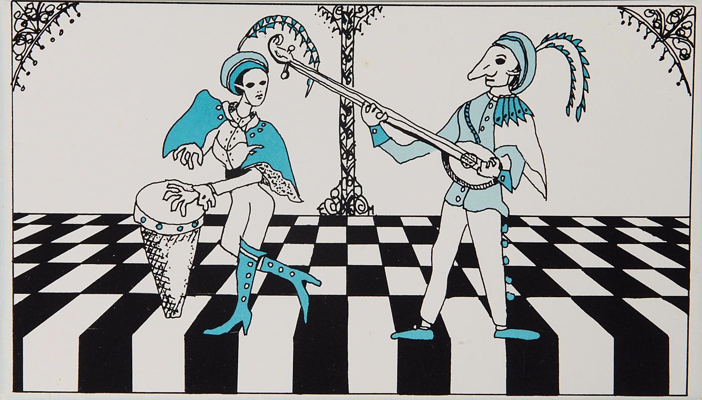 Original artwork drawn by Elizabeth Moore for Sheila E.'s 29th birthday party, with the image measuring 6.5 x 3.5 on a 16 x 13 sheet, portraying two medieval musicians on a checkerboard floor; the embellishments in the corners and center are on a celluloid overlay. Signed and dated in the lower right by the artist. Matted to an overall size of 21 x 18. In fine condition, with some portions of staining to lower blank portion and a fold to lower right corner of celluloid. Accompanied by two copies of the corresponding invitation that used this artwork, which has details for the party on the reverse: "A Birthday for Sheila E., You & one guest are invited to the celebration at: 'Vertigo,' 1924 S. Grand, downtown L.A. at the corner of Olympic, Thursday December 11, 1986, 9:00 P.M., (please present this invitation at the door)." From the collection of Elizabeth Moore and accompanied by a letter of provenance. Moore worked for Prince on the Purple Rain Tour as his personal wardrobe assistant, as well as event designer and decorator; she also worked intimately with Prince designing and creating original artwork for his party invitations and personal holiday cards.