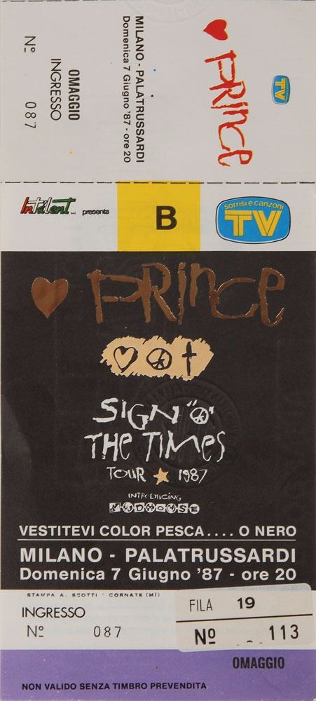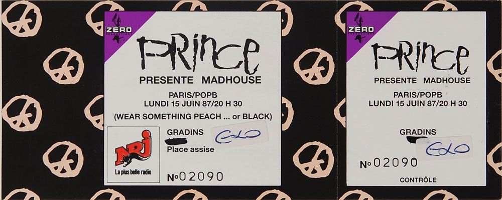 Two full tickets for international shows during Prince's 1987 Sign o' the Times Tour, including: one 3.5 x 7.5 ticket for the show on Prince's birthday at Milan's Palatrussardi, June 7, 1987; and one 6.75 x 2.75 ticket a show by the Prince-produced Madhouse at the Paris jazz club New Morning on June 15, 1987. Madhouse was Prince's support band on the Sign o' the Times Tour, and did a one-off club gig in Paris for which this was a ticket. In overall fine condition, with light mounting remnants to reverse of each. From the collection of Prince's assistant tour manager Gwen Leeds.