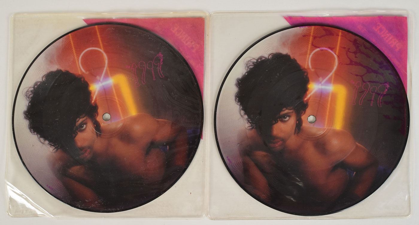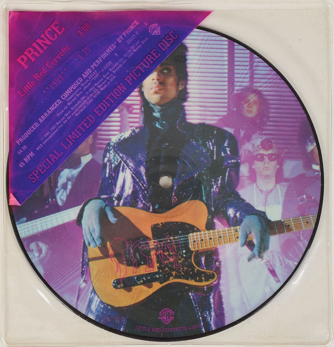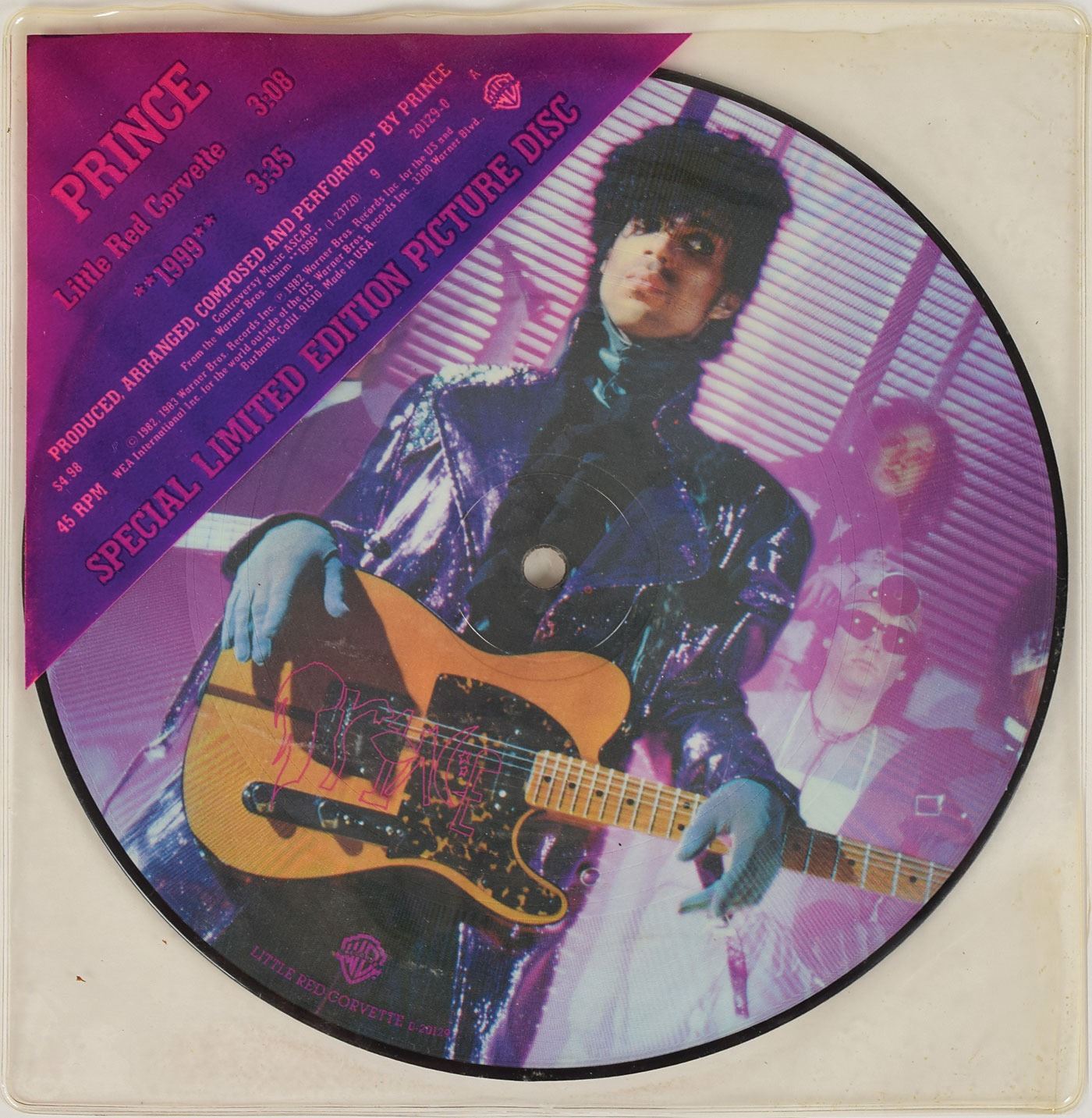 Three items related to Prince's 1999 album, including: two special limited edition 7? picture disc singles of 'Little Red Corvette / 1999,' in their original sleeves; and a 10.5 x 14.5 magazine page or mini poster depicting Prince, headed, "Welcome to 1999," listing the 1982 concert dates. In overall fine condition. From the collection of an early Prince insider.