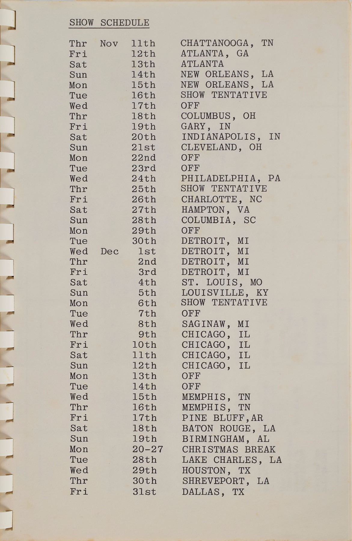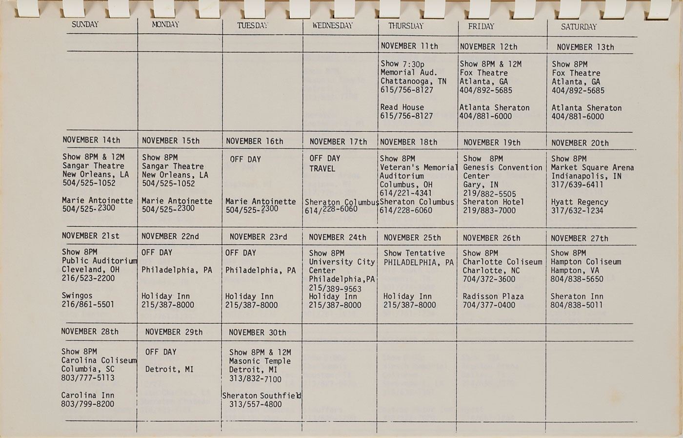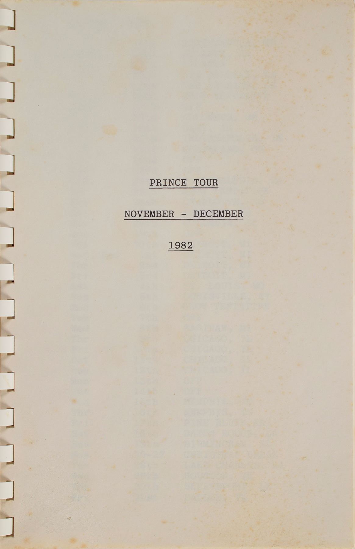 Three items from Prince's 1999 Tour in 1982: an original 6 x 8.5 spiral-bound itinerary with a "1999" cover image, marked "Carol," listing the band personnel, crew contacts, hotels, and venues for the tour from November 11–December 31, 1982; a laminated backstage pass featuring an image of the 1999 album cover, also naming the acts "Vanity 6" and "The Time," with text reading, "Access All Area"; and a 10.5 x 14.5 magazine page or mini poster depicting Prince, headed, "Welcome to 1999," listing the 1982 concert dates. In overall very good to fine condition, with foxing to covers and first few pages of itinerary book, and scattered creasing to the mini poster. From the collection of an early Prince insider.