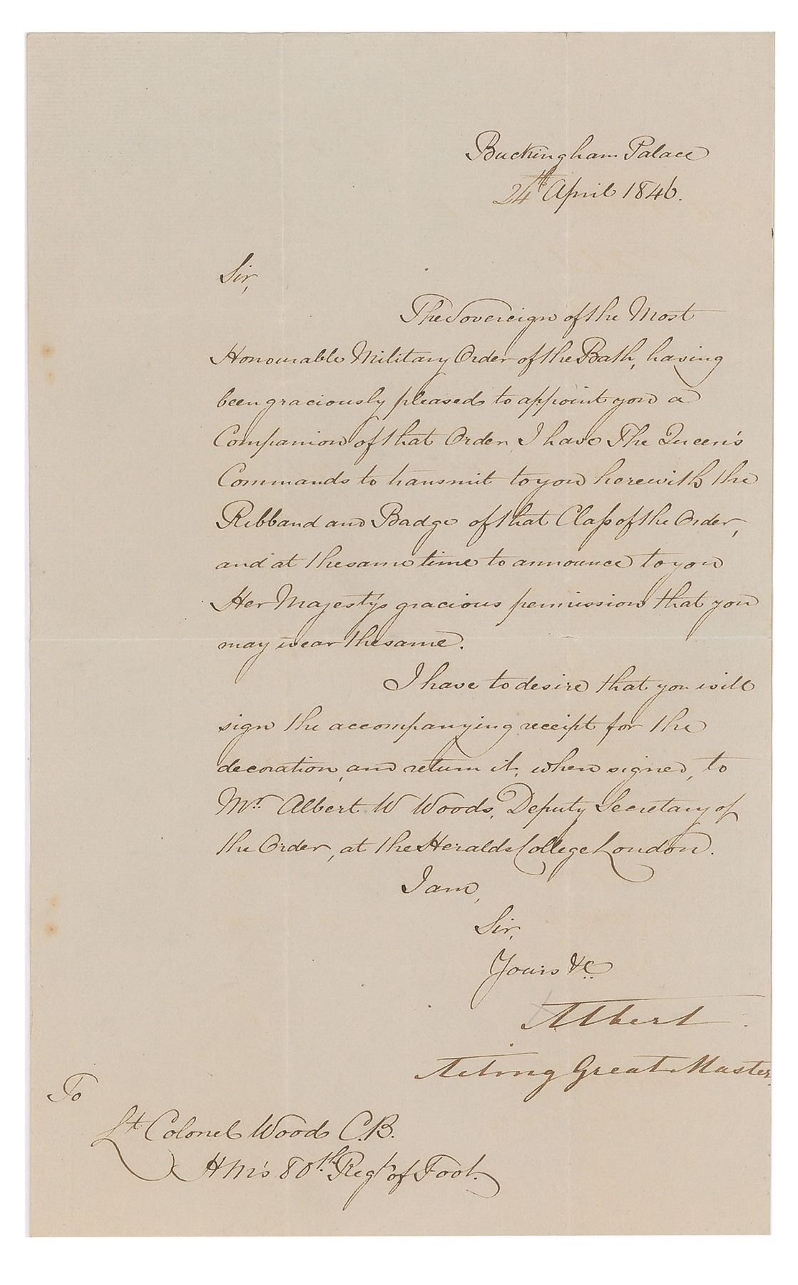 LS signed “Albert, Acting Great Master,” one page, 7.75 x 12.75, April 24, 1846. Written from Buckingham Palace, a letter to Lt. Colonel Woods, in part: "The Sovereign of the Most Honourable Military Order of the Bath, having been graciously pleased to appoint you a Companion of that Order I have The Queen's Commands to transmit to you herewith the Ribband and Badge of that Class of the Order, and at the same time to announce to you Her Majesty's gracious permission that you may wear the same." In fine condition, with intersecting folds.