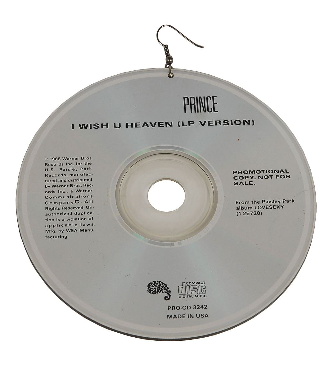 Unusual circa 1988 custom-made earring consisting of a promotional CD single for I Wish U Heaven. In fine condition. Consignor notes that Prince gifted her the earring after she complimented him on a similar example he wore into her office earlier in the day.