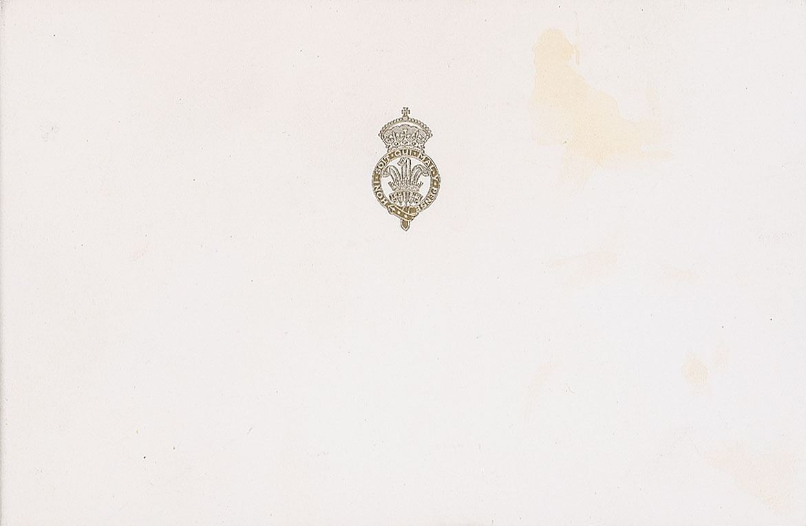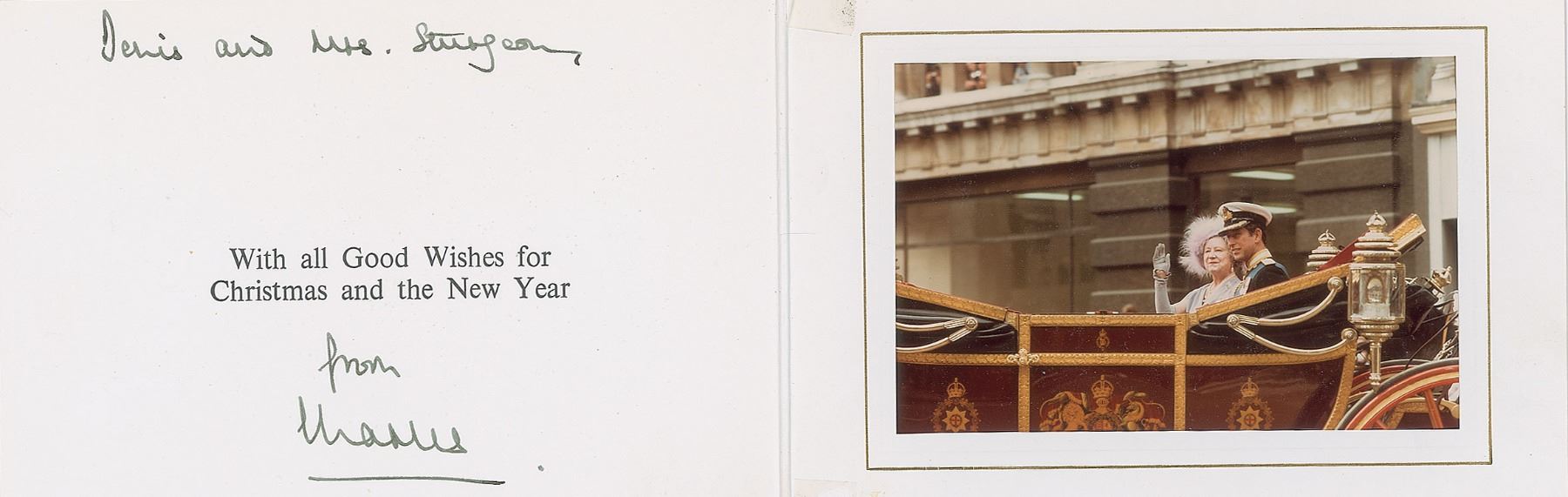 Royal Christmas card from circa 1978 embossed on the front with the Prince of Wales’s feathers and Order of the Garter motto, measuring 14.5 x 4.75, featuring an image of Prince Charles with Queen Elizabeth waving from a carriage, signed and inscribed on the opposite side in fountain pen "Denis and Mrs. Sturgeon, from Charles." In fine condition, with small pieces of scotch tape next to the hinge on the photo panel, and a light stain to the front.