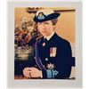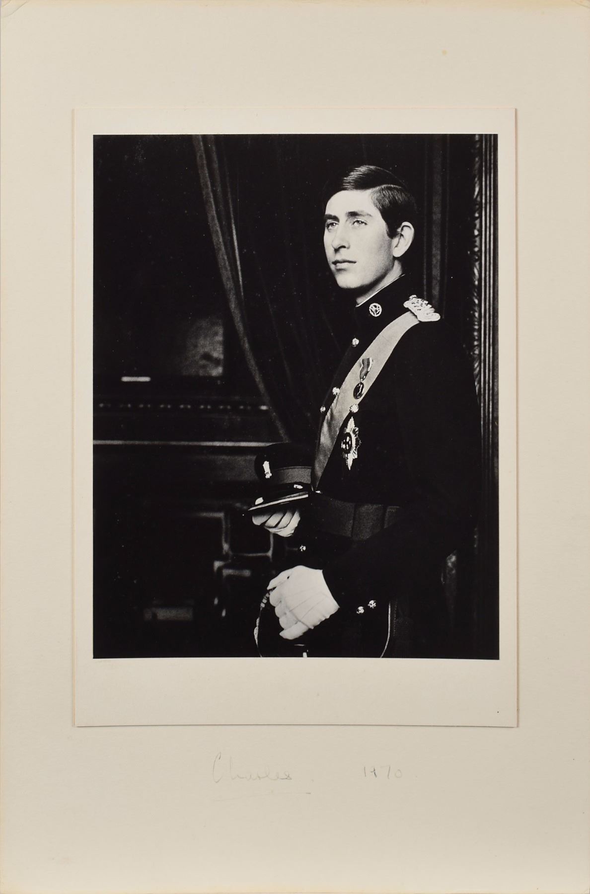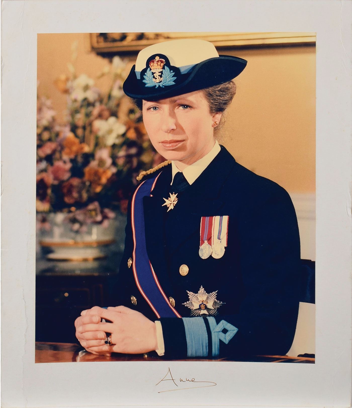 Two photos: a matte-finish 9.75 x 13.75 half-length portrait of a young Prince Charles posing in military uniform, affixed to the original 13 x 19.75 mount, signed on the mount in fountain pen, "Charles, 1970"; and a color semi-glossy 11.75 x 14.5 seated portrait of Princess Anne wearing honorary military regalia, affixed to the original 14.75 x 18 mount, signed on the mount in black ink, "Anne." The Charles photo is in fine condition, with bumps to three corners and the signature light but fully legible; the Anne photo shows heavy creasing in the borders, which cold be successfully matted out if so desired.