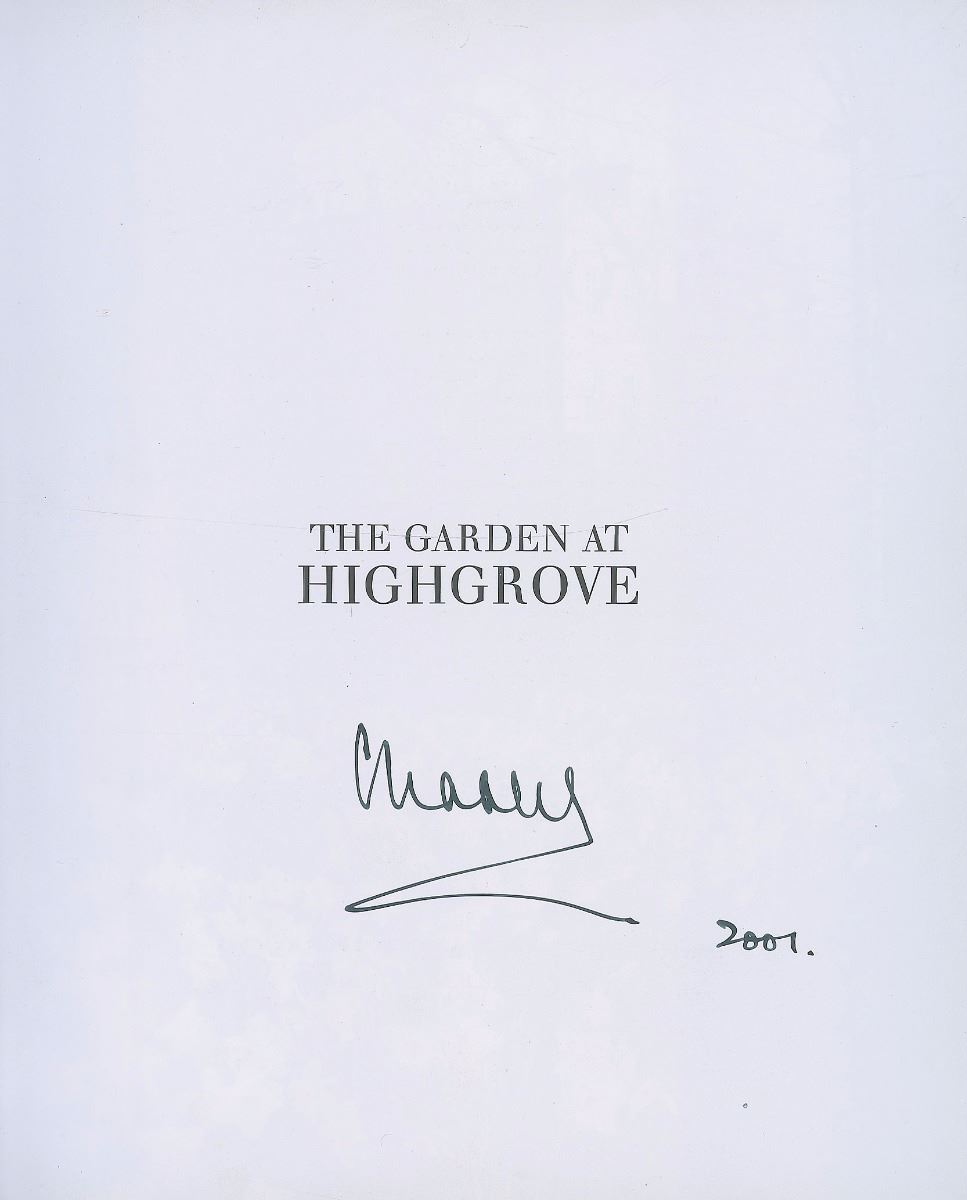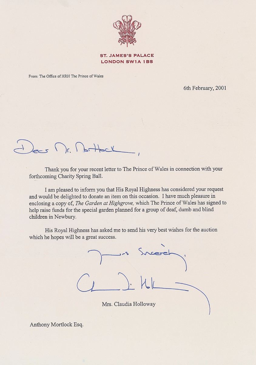 Signed book: The Garden at Highgrove. First edition. London: Weidenfeld & Nicolson, 2000. Hardcover with dust jacket, 9.75 x 11.75, 176 pages. Signed on the half-title page in fountain pen, “Charles, 2001.” In fine condition. Accompanied by the original transmittal letter from his office at St. James’s Palace, donating the book to a fundraiser in aid of a special ‘sensory garden’ for disabled children.