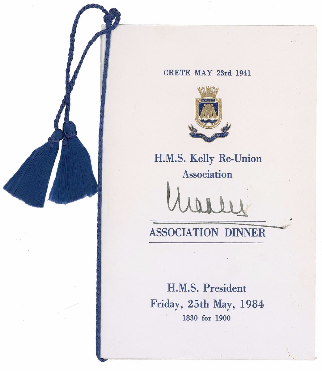 H.M.S. Kelly Re-Union Association dinner menu held in remembrance of the sinking of the aforesaid vessel on May 23, 1941, held aboard the H.M.S. President on May 25, 1984, 4 pages, 4.5 x 7, signed on the front cover in black felt tip, “Charles.” The menu retains its original blue roping and tassels. In fine condition, with trivial creasing to spine, slight soiling to covers, and a brush to the end of the signature’s underline.
