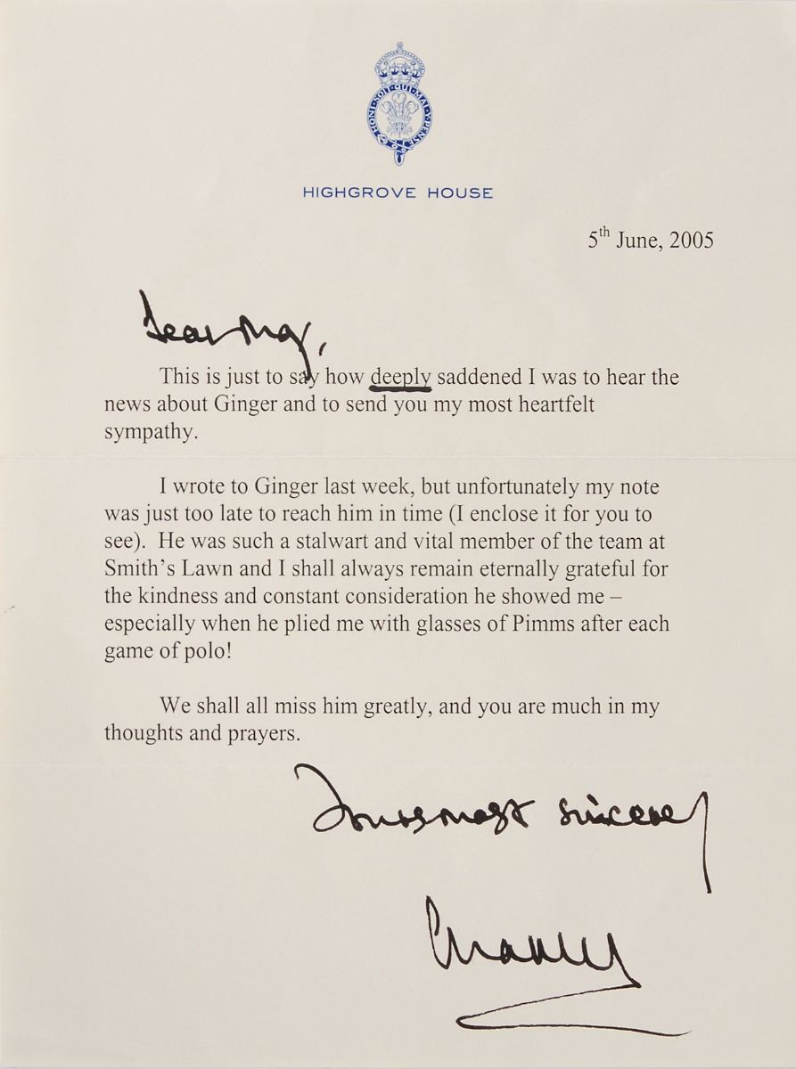 TLS signed “Yours most sincerely, Charles,” one page, 7.25 x 9.25, Highgrove House letterhead, June 5, 2005. Letter to May Balfour, in part: “This is just to say how deeply saddened I was to hear the news about Ginger and to send you my most heartfelt sympathy. I wrote to Ginger last week, but unfortunately my note was just too late to reach him…He was such a stalwart and vital member of the team at Smith’s Lawn and I shall always remain eternally grateful for the kindness and constant consideration he showed me—especially when he plied me with glasses of Pimms after each game of polo!” In fine condition. Accompanied by the original mailing envelope.